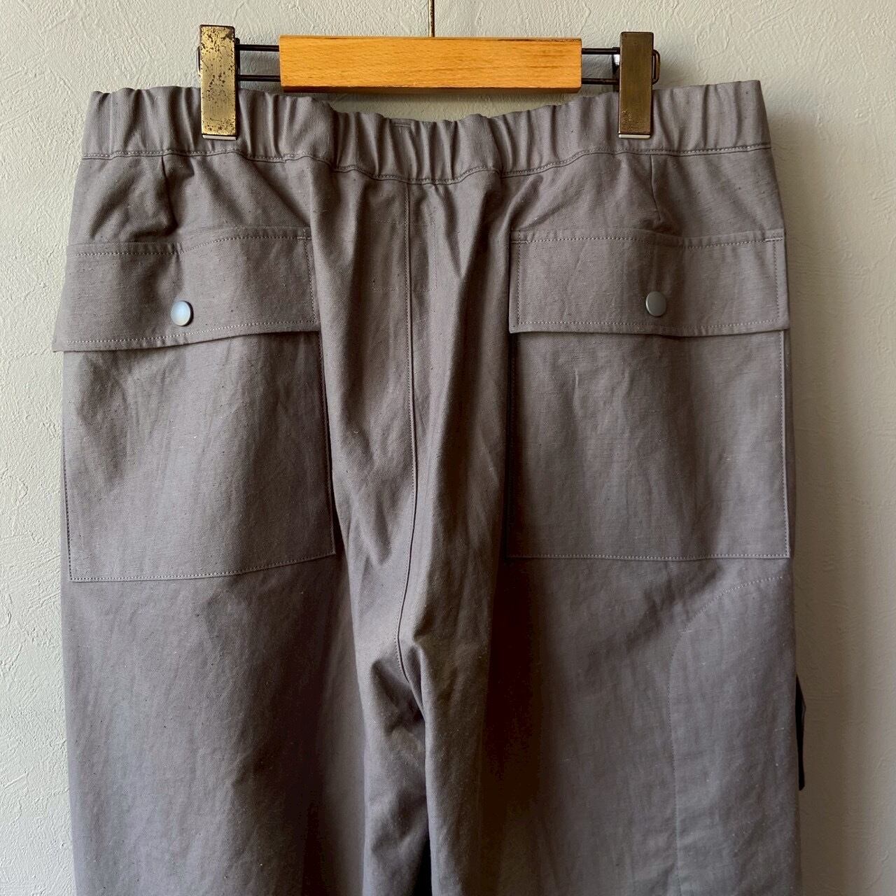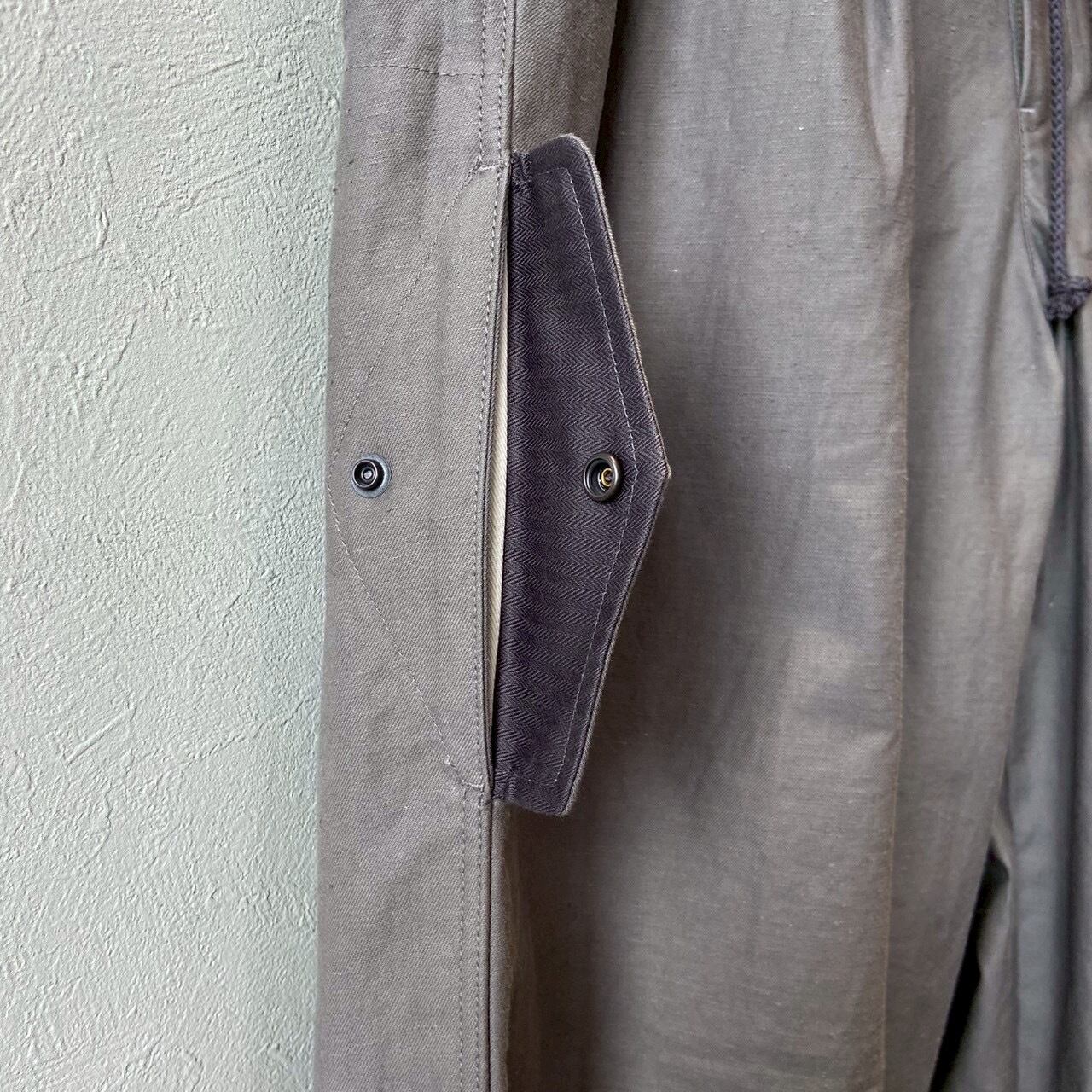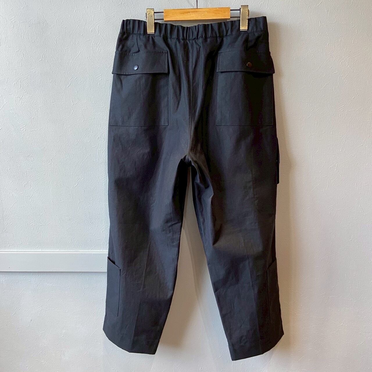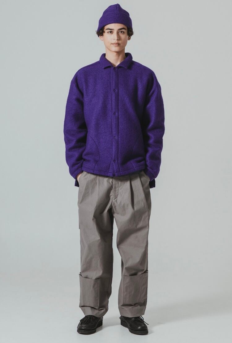 乾燥感のあるアメリカ、オーストラリアの混合綿を使用、その原綿をカーディングする際、機械の調整でネップを作り、レピア織機で糸に強度を加えながら織ることで生地自体の強度を高めたバックネップ素材を使用したBNナインポケットパンツです。このバックネップ素材は表面に上品さを出すためシルケット加工をせず染色、ネップの凹凸を残しながら自然で上品な表情に仕上げました。またハリコシを出すために樹脂で硬仕上げを施し防風性の向上と洗濯による形状変化を抑える加工を加えました。デザインはボリュームのある2タックのルーキーパンツシルエットに両サイドに2つ、ヒップに2つ、右脇に1つ、ヒザ下に4つのポケットを配しバッグなしで観戦できる専用パンツです。