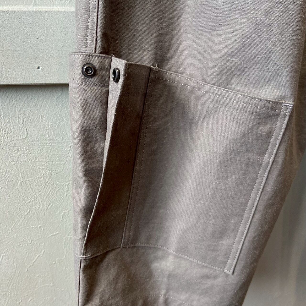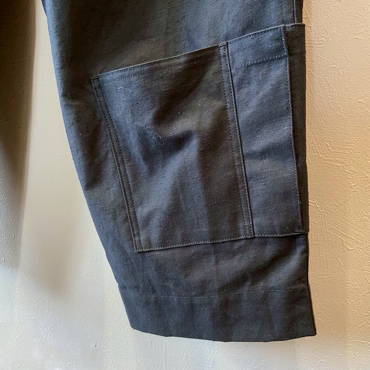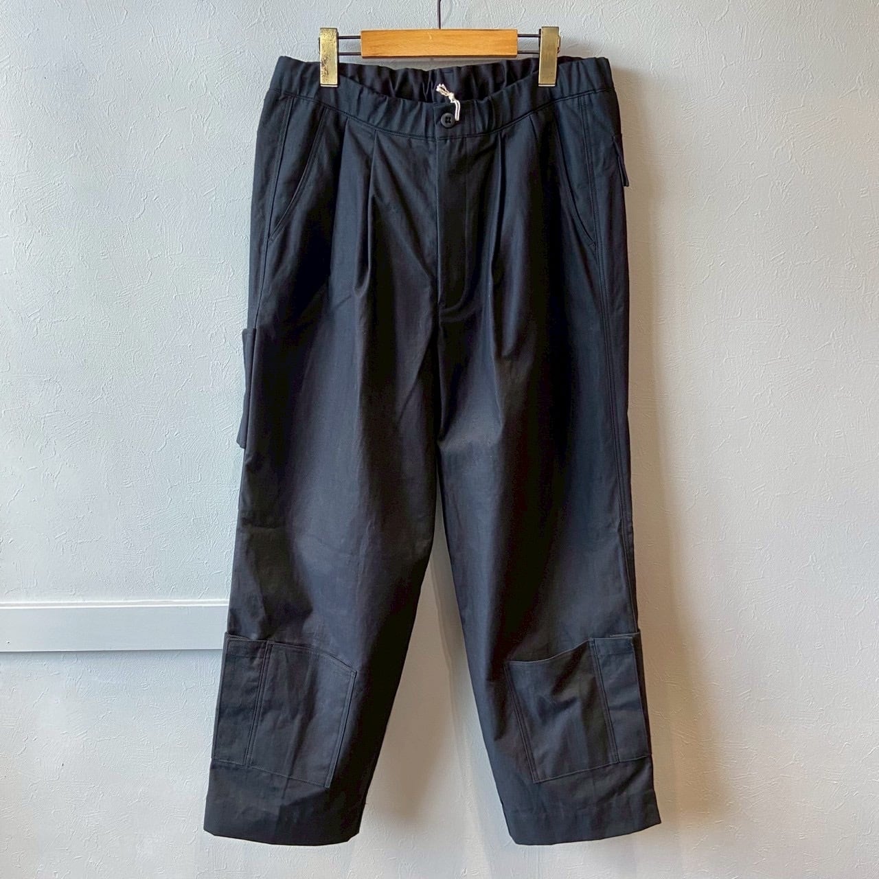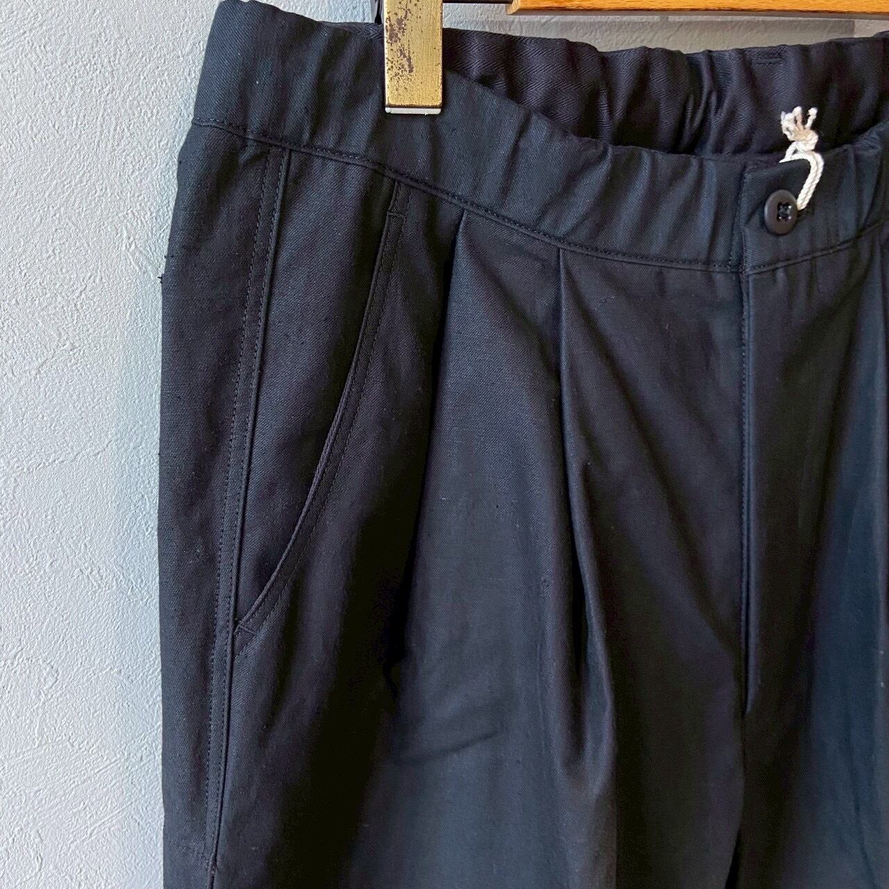 乾燥感のあるアメリカ、オーストラリアの混合綿を使用、その原綿をカーディングする際、機械の調整でネップを作り、レピア織機で糸に強度を加えながら織ることで生地自体の強度を高めたバックネップ素材を使用したBNナインポケットパンツです。このバックネップ素材は表面に上品さを出すためシルケット加工をせず染色、ネップの凹凸を残しながら自然で上品な表情に仕上げました。またハリコシを出すために樹脂で硬仕上げを施し防風性の向上と洗濯による形状変化を抑える加工を加えました。デザインはボリュームのある2タックのルーキーパンツシルエットに両サイドに2つ、ヒップに2つ、右脇に1つ、ヒザ下に4つのポケットを配しバッグなしで観戦できる専用パンツです。