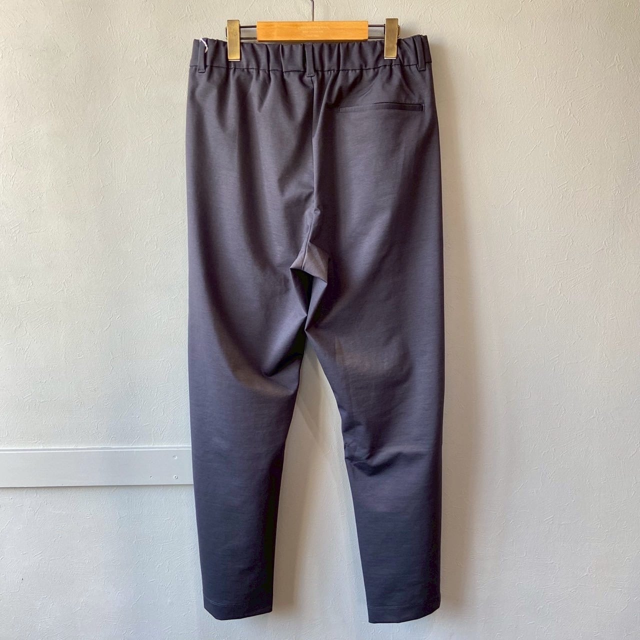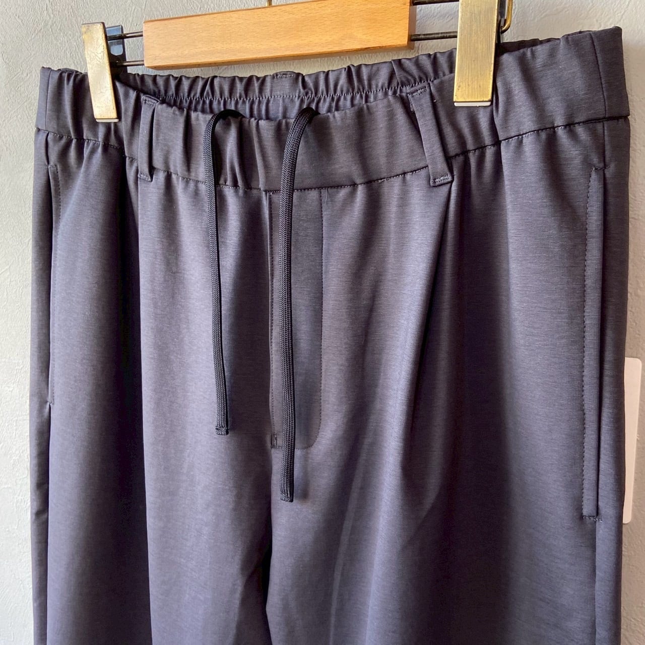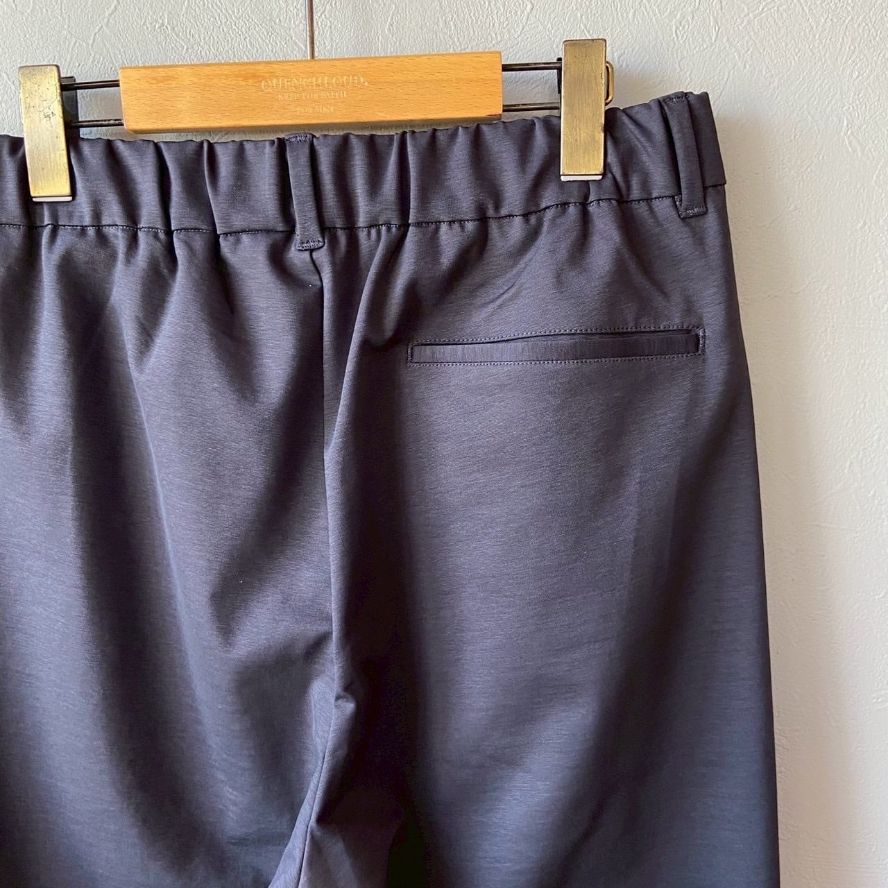 腰回りはドローコードできゅっと絞るイージーパンツ仕様で、腰の位置の上げ下げで、ジャスト?ワンクッションレングスとその日の気分で変えても良さそうですね。ベルトループも付いているので幅広いスタイリングが楽しめます。スッキリした印象でかつリラックス感のある大人が穿いても楽しめる上品さが漂うカジュアルなパンツコレクション。バックポケットは片側だけのジップポケットを配置。