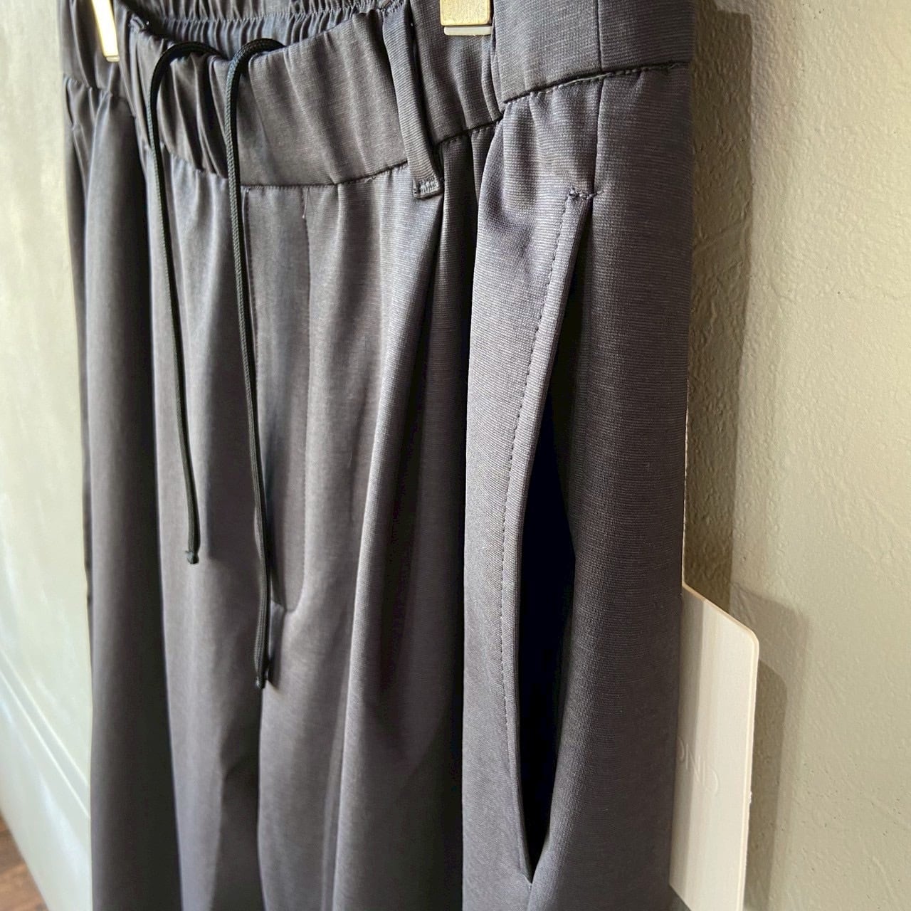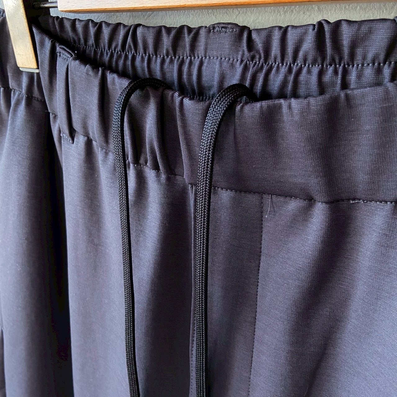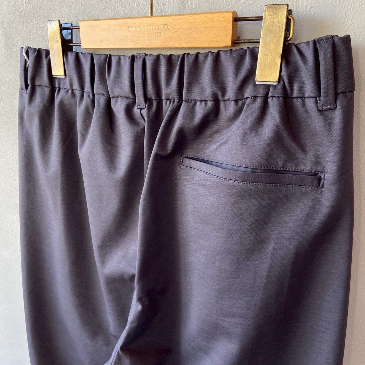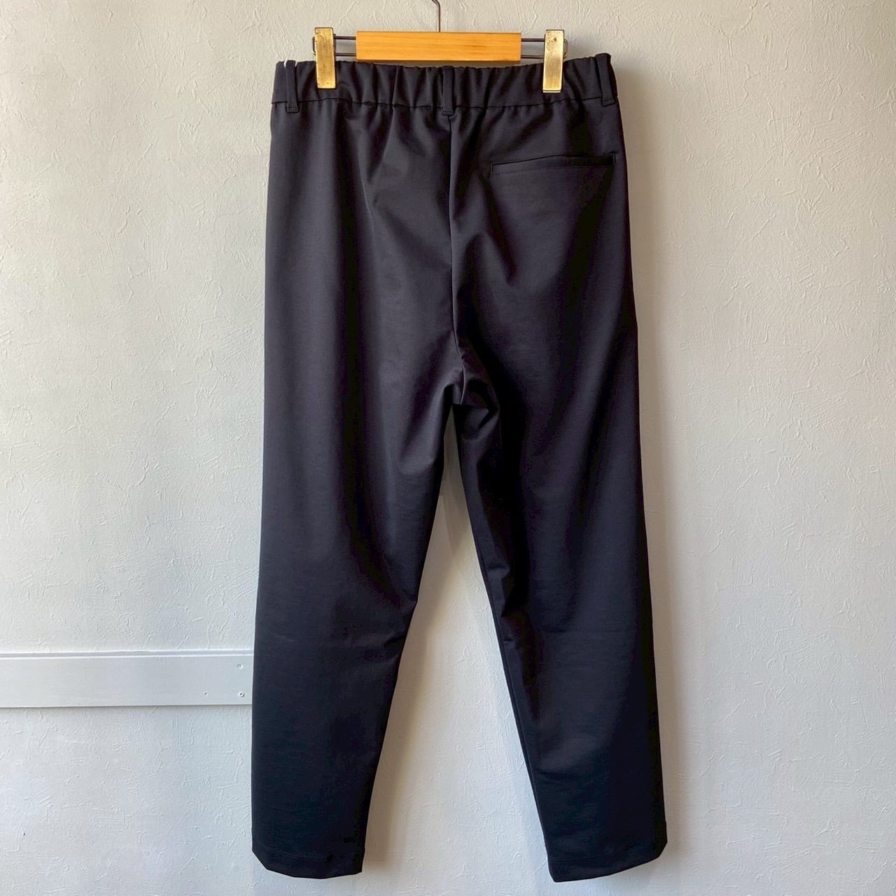 腰回りはドローコードできゅっと絞るイージーパンツ仕様で、腰の位置の上げ下げで、ジャスト?ワンクッションレングスとその日の気分で変えても良さそうですね。ベルトループも付いているので幅広いスタイリングが楽しめます。スッキリした印象でかつリラックス感のある大人が穿いても楽しめる上品さが漂うカジュアルなパンツコレクション。バックポケットは片側だけのジップポケットを配置。