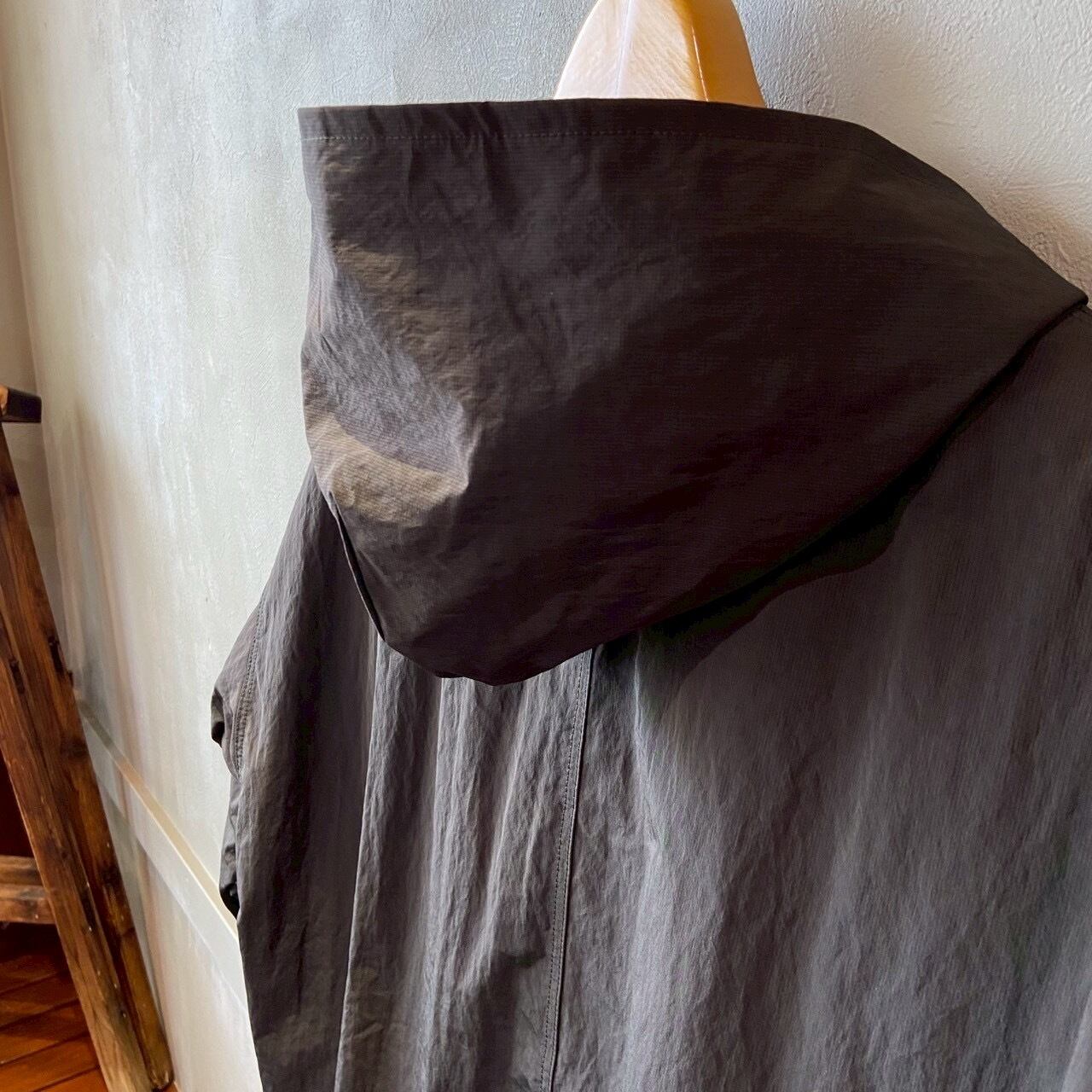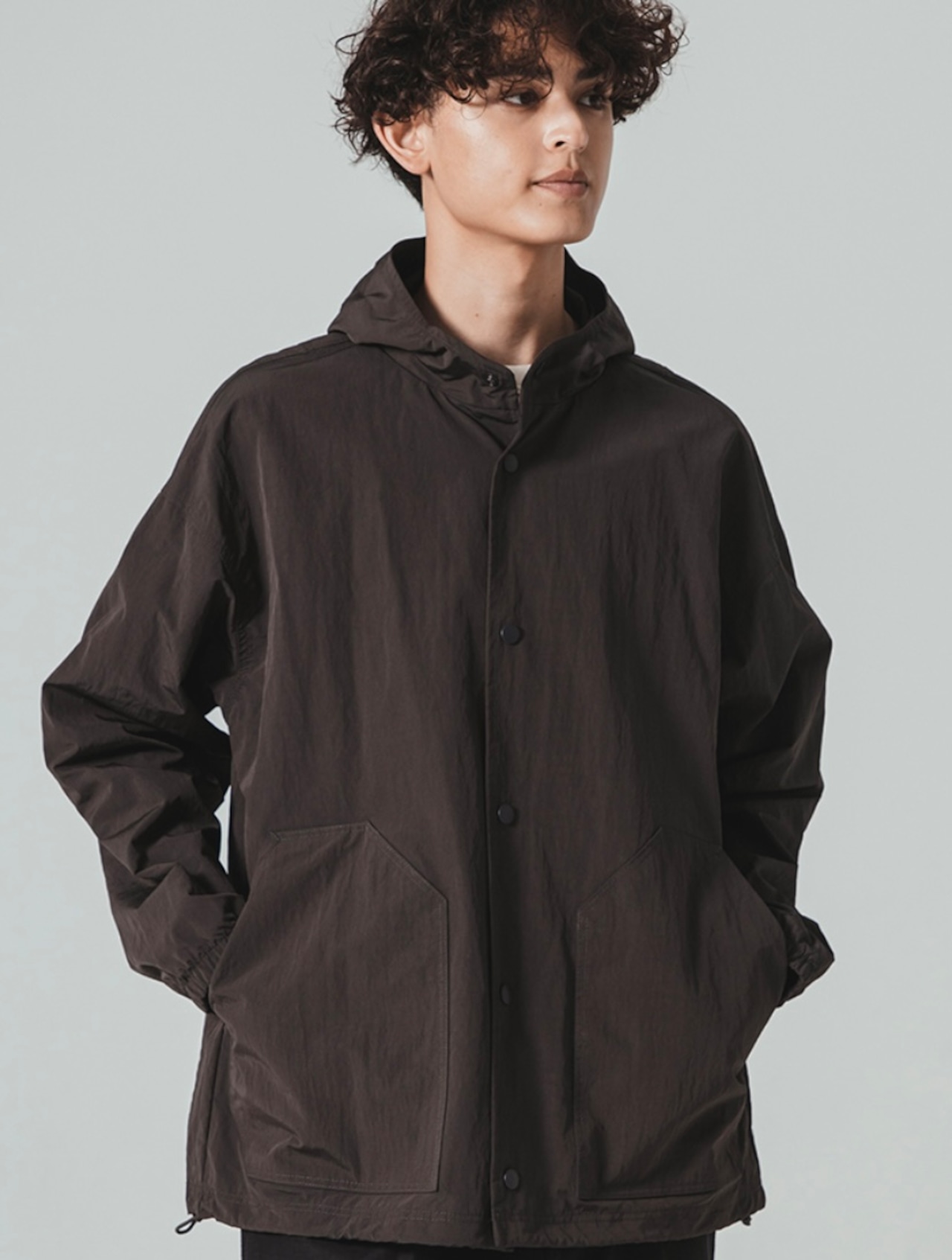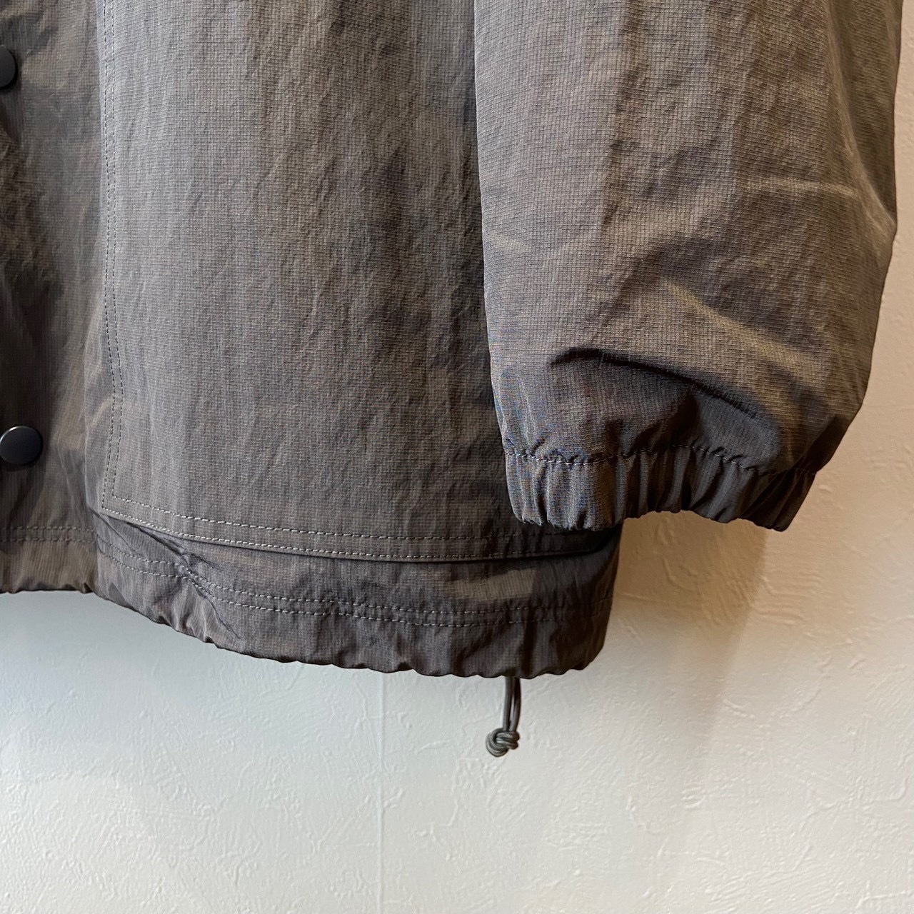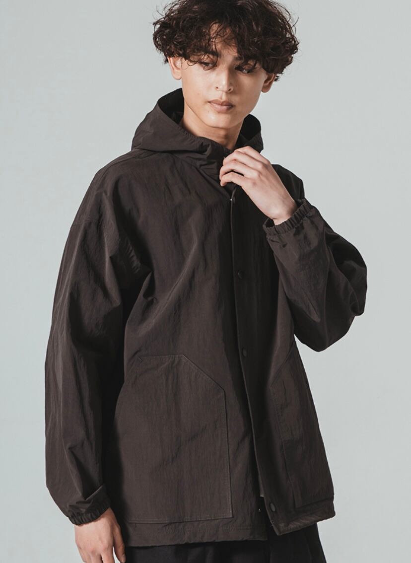 膨らみがありしっとりとした細かな組織のリップ生地を使用したベンチパーカです。ナイロンとポリエステルをアルカリ処理した糸を使用することで環境に優しく接触冷感、撥水機能も備えた夏の羽織ジャケット素材として開発しました。デザインはベンチで出番を待つ選手が着用するパーカを参考にサッと羽織れるオーバーサイズ感とボックスシルエットを採用。主要縫製をWステッチでおこなうことでパッカリング気味の縫合部分に立体感が生まれ裾のアジャスターコードで丸みのあるシルエットが作れます。A5サイズのビッグサイズポケットや着脱しやすいドットボタンといった夏場の着用を考えたギミックを加えました。