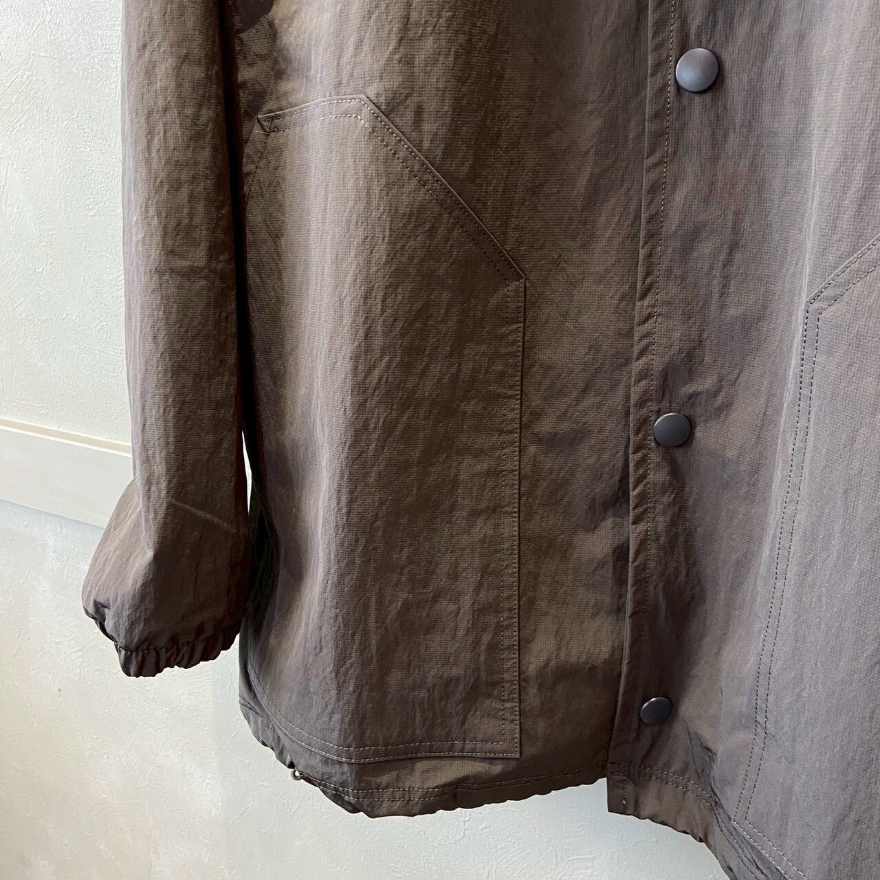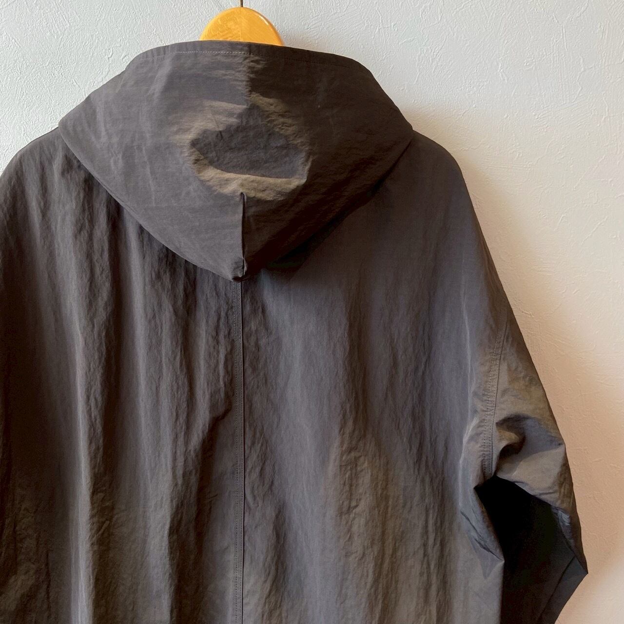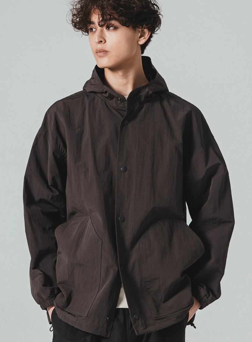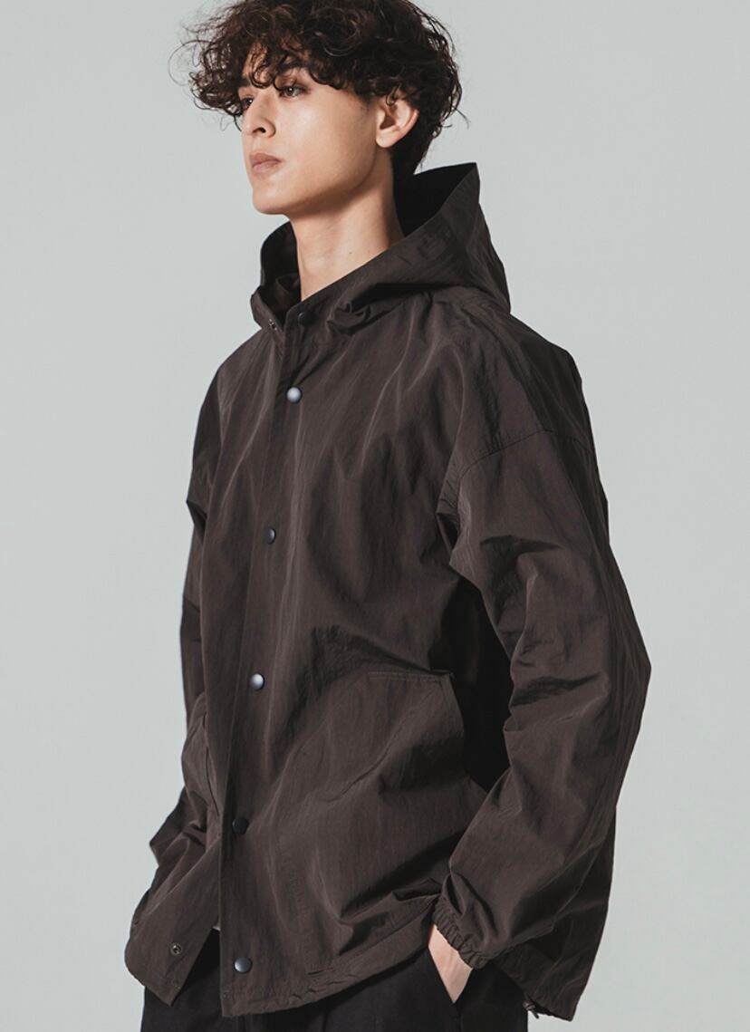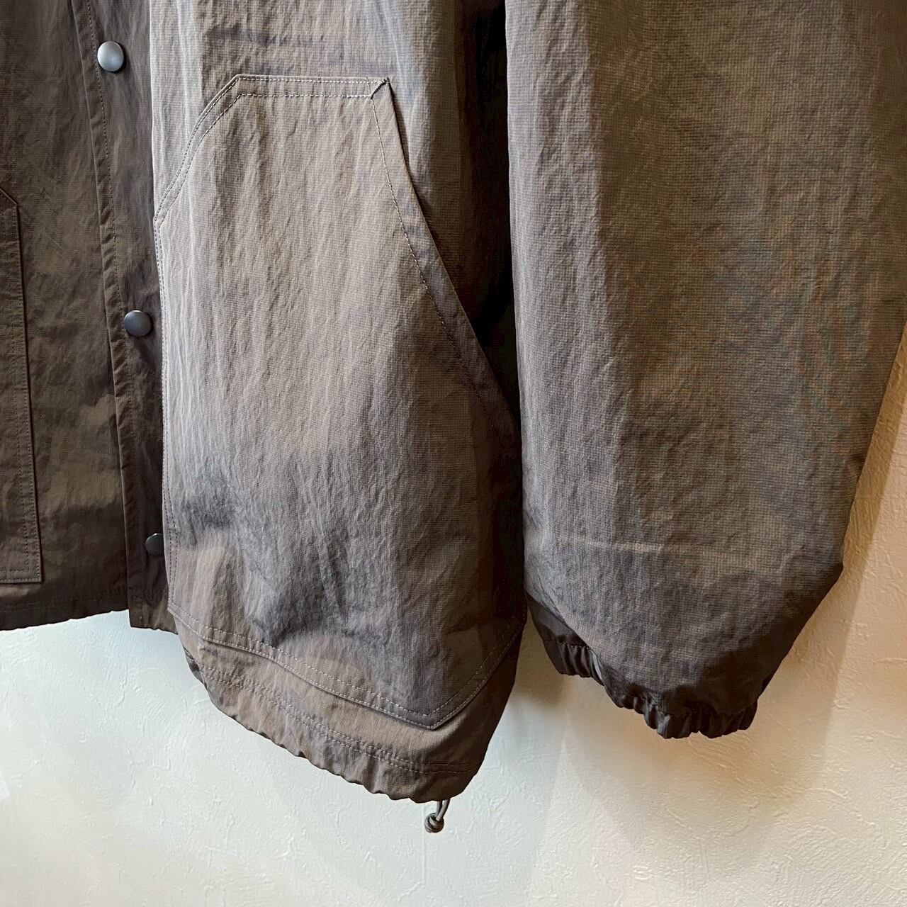 膨らみがありしっとりとした細かな組織のリップ生地を使用したベンチパーカです。ナイロンとポリエステルをアルカリ処理した糸を使用することで環境に優しく接触冷感、撥水機能も備えた夏の羽織ジャケット素材として開発しました。デザインはベンチで出番を待つ選手が着用するパーカを参考にサッと羽織れるオーバーサイズ感とボックスシルエットを採用。主要縫製をWステッチでおこなうことでパッカリング気味の縫合部分に立体感が生まれ裾のアジャスターコードで丸みのあるシルエットが作れます。A5サイズのビッグサイズポケットや着脱しやすいドットボタンといった夏場の着用を考えたギミックを加えました。