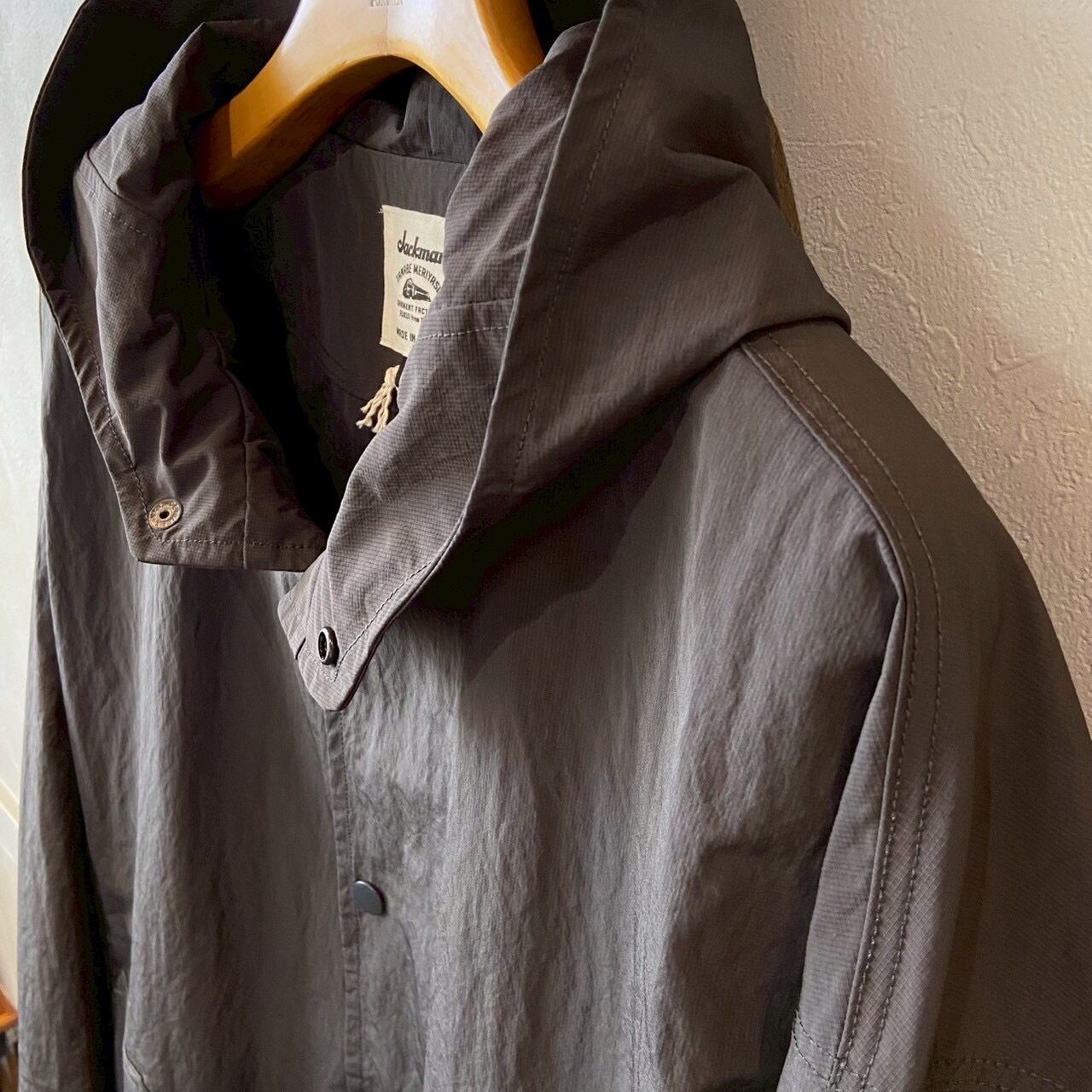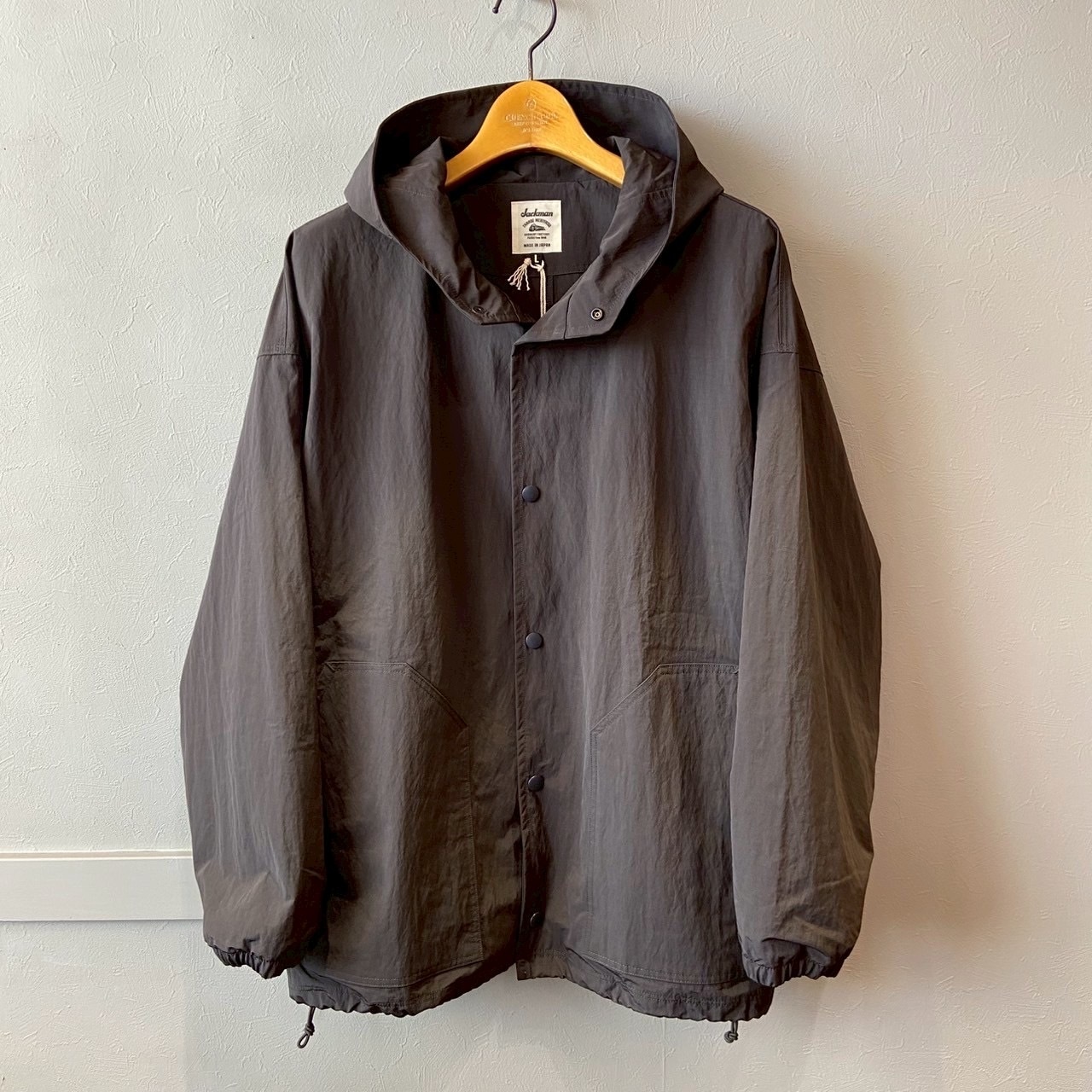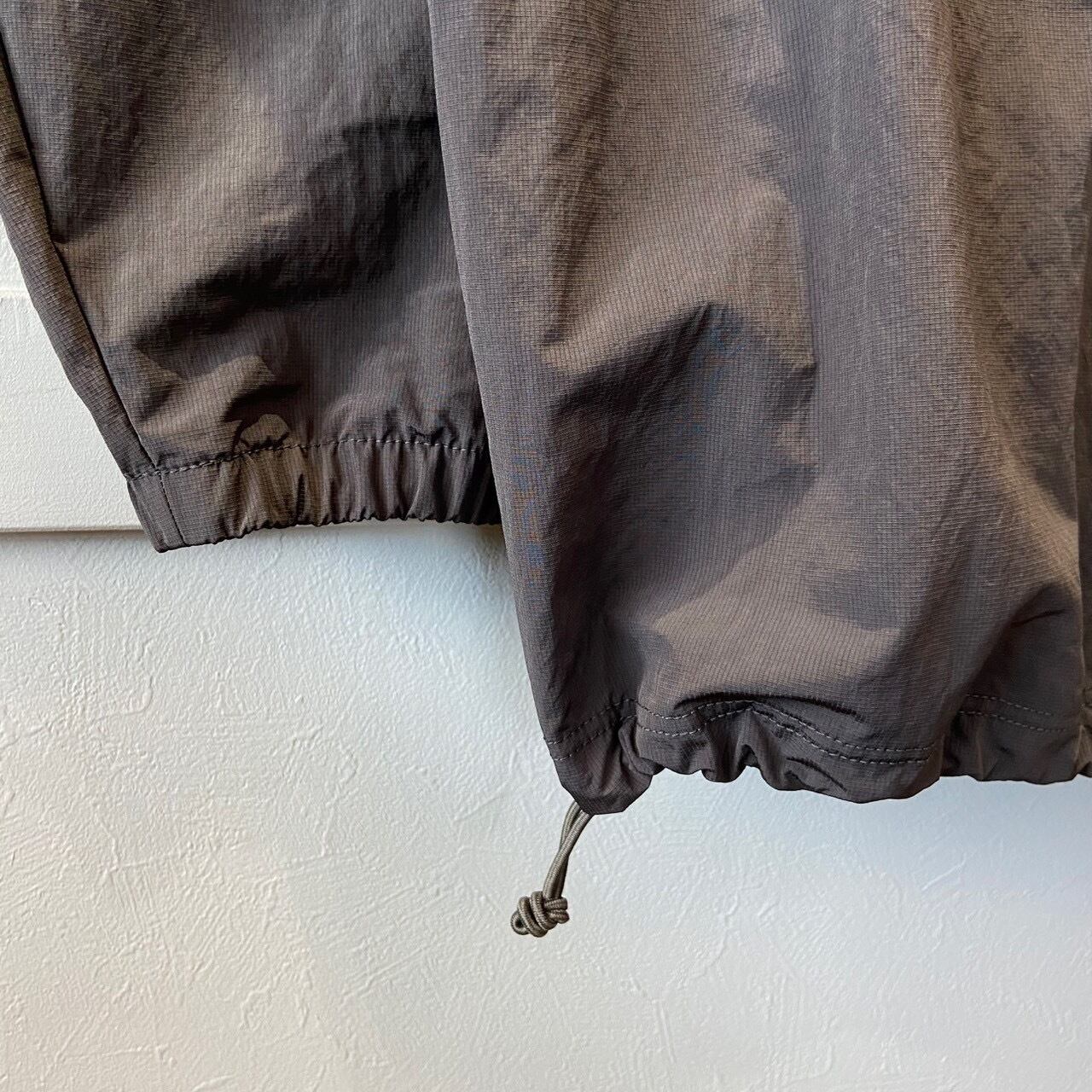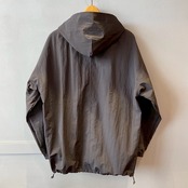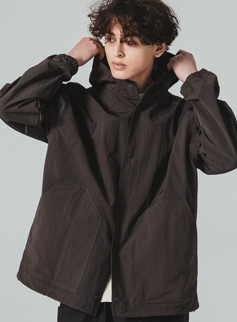 膨らみがありしっとりとした細かな組織のリップ生地を使用したベンチパーカです。ナイロンとポリエステルをアルカリ処理した糸を使用することで環境に優しく接触冷感、撥水機能も備えた夏の羽織ジャケット素材として開発しました。デザインはベンチで出番を待つ選手が着用するパーカを参考にサッと羽織れるオーバーサイズ感とボックスシルエットを採用。主要縫製をWステッチでおこなうことでパッカリング気味の縫合部分に立体感が生まれ裾のアジャスターコードで丸みのあるシルエットが作れます。A5サイズのビッグサイズポケットや着脱しやすいドットボタンといった夏場の着用を考えたギミックを加えました。
