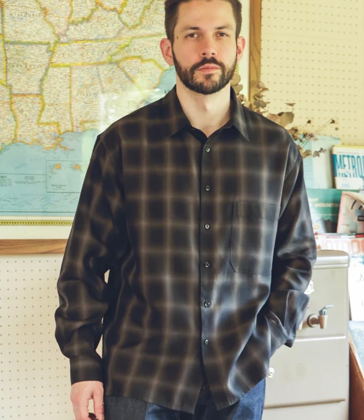 テンセル糸を高密度に織りあげることで、ドレープ性がありながらもしっかりとした生地感に仕上げた素材。じわっとした奥行きのあるオンブレチェックに仕上げています。綺麗なシルエットとレギュラーカラー、胸ポケット、ミニマムなデザインにする事でカジュアルから綺麗目まで幅広く合わせる事が可能。ラウンドヘムによりサイドからのルックがスタイリッシュな印象を演出します。