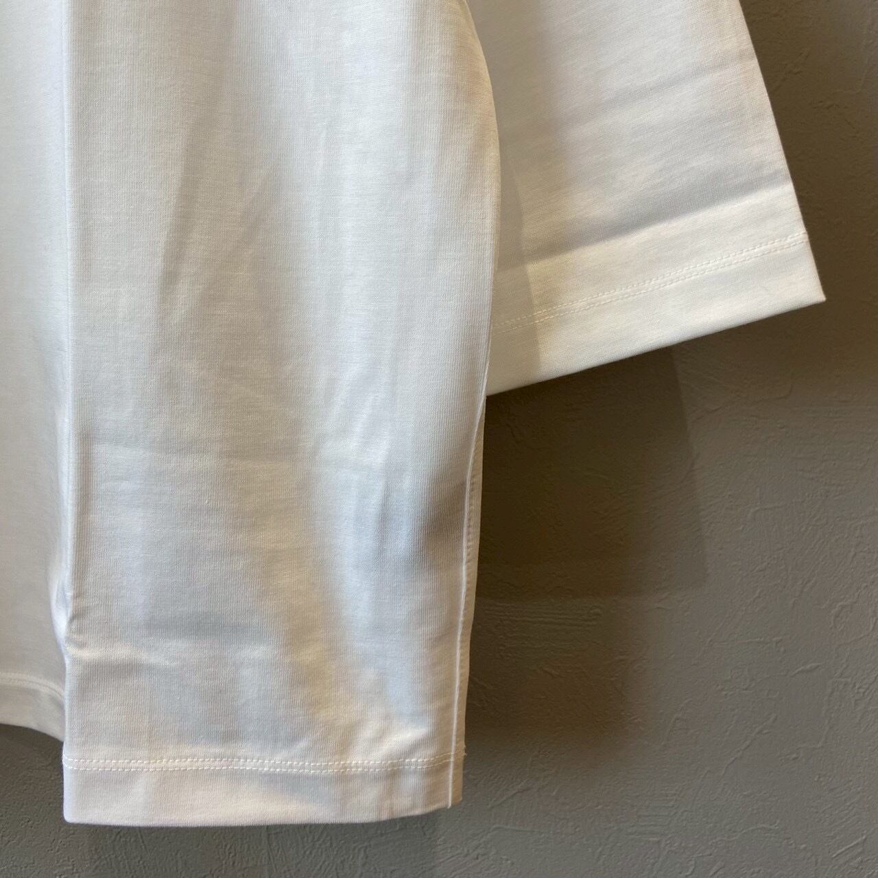 袖丈は8分袖に設定し、太めのネックライン、ドロップショルダー、ゆとりのあるアームホールが特徴。袖を捲っても自然にまとまる、計算されたディテールです。