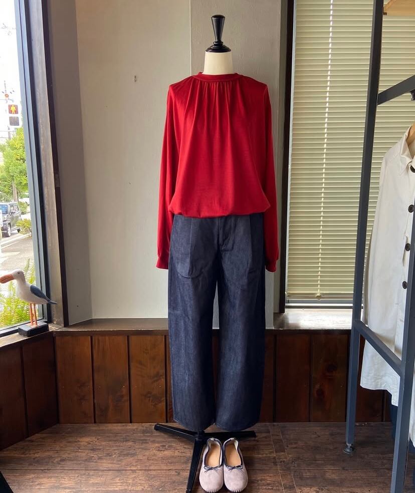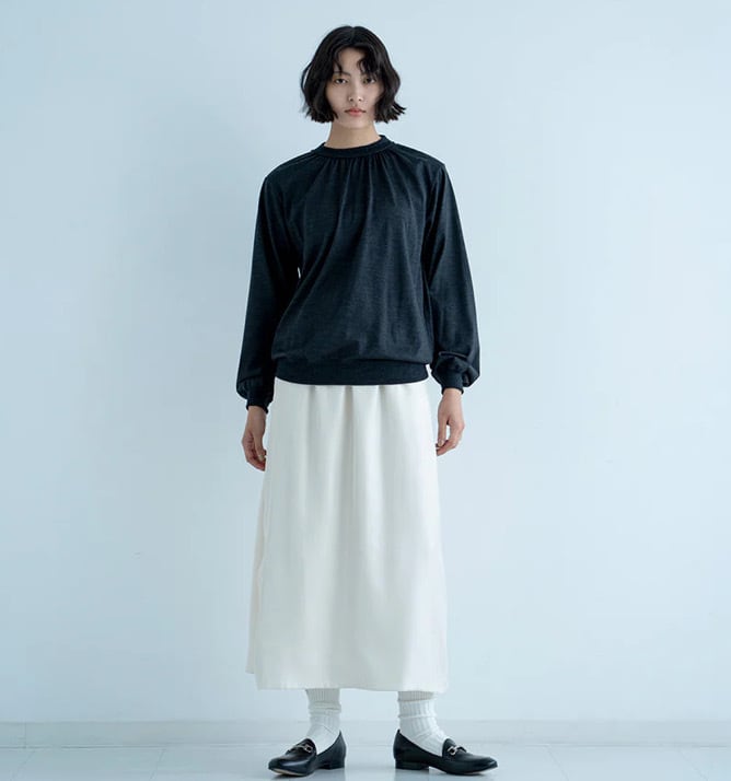 衿ぐりにギャザーを入れ柔らかくふんわりとしたシルエットに仕上げました。