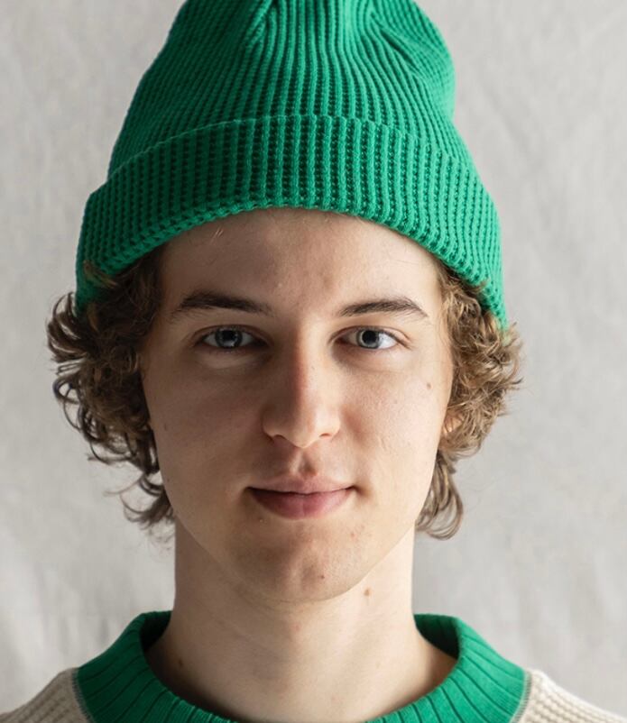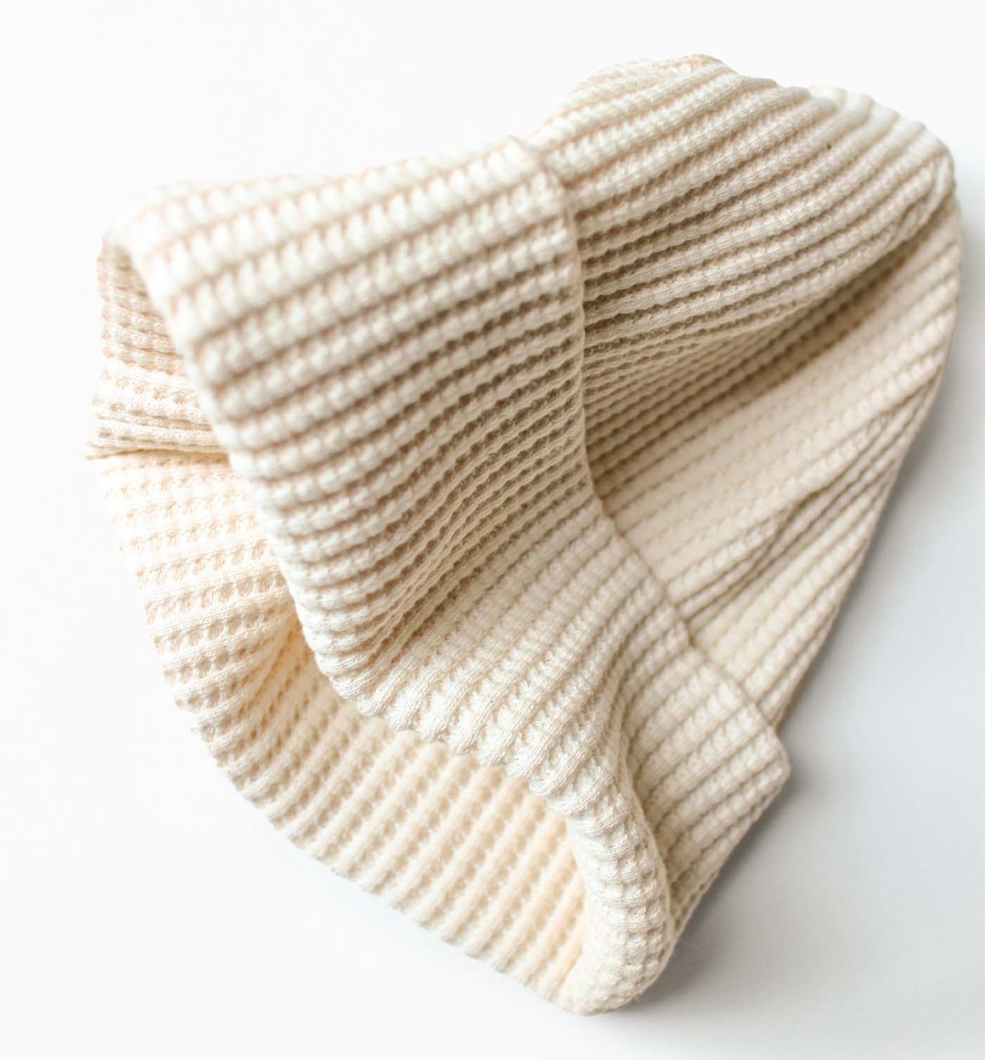 独特のムラ感が特徴的なラフィ綿糸をダブルジャカード編み機で編み立てた粒立が大きいビッグワッフルを使用したニットキャップです。ビッグワッフルは温かみのある表情でふっくらとした肉厚な素材感ながら耐久性も兼ね備えた素材です。永く愛用していただくためにロール状になったビッグワッフルの原反を放反し一度、リラックスさせてから裁断、縫製。着用と洗濯を繰り返しても歪みや縮みが起こりにくくする工夫と手間を加えています。着用時可愛く見えるように先端が少し余る独自の設計です。