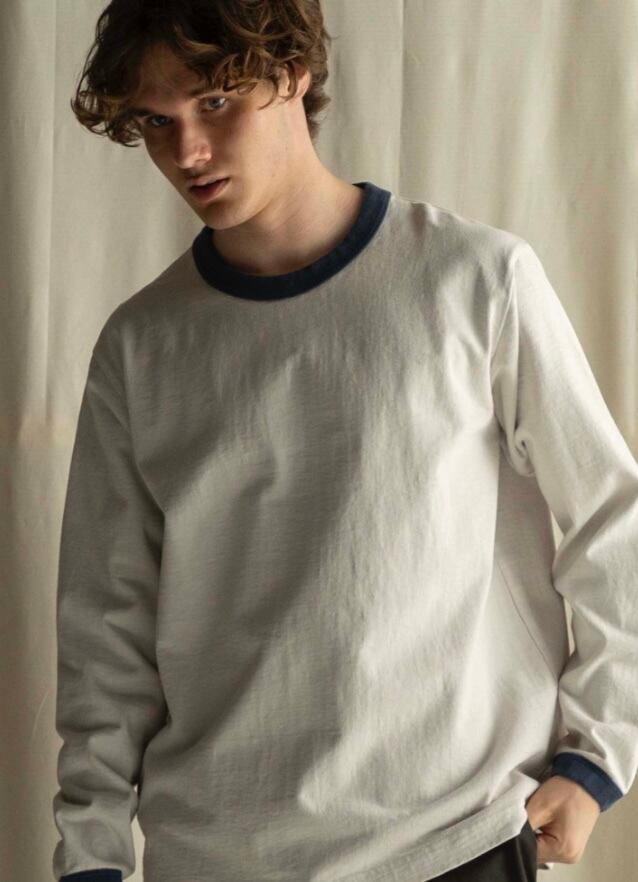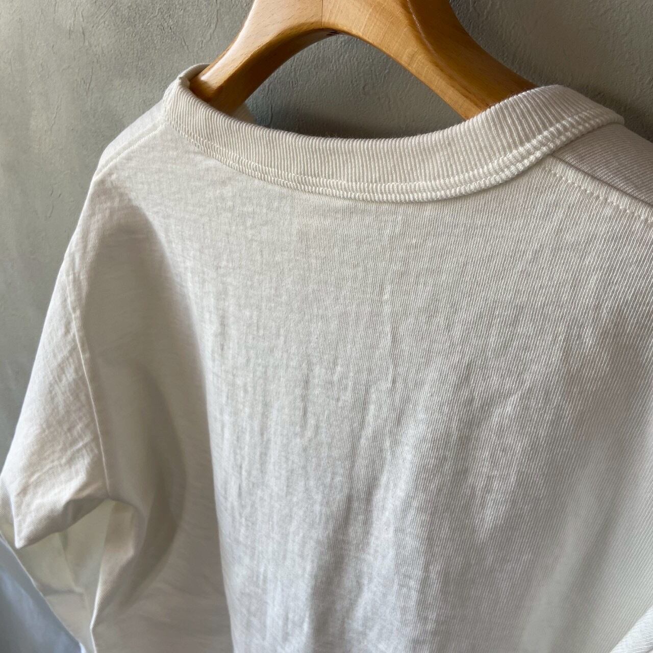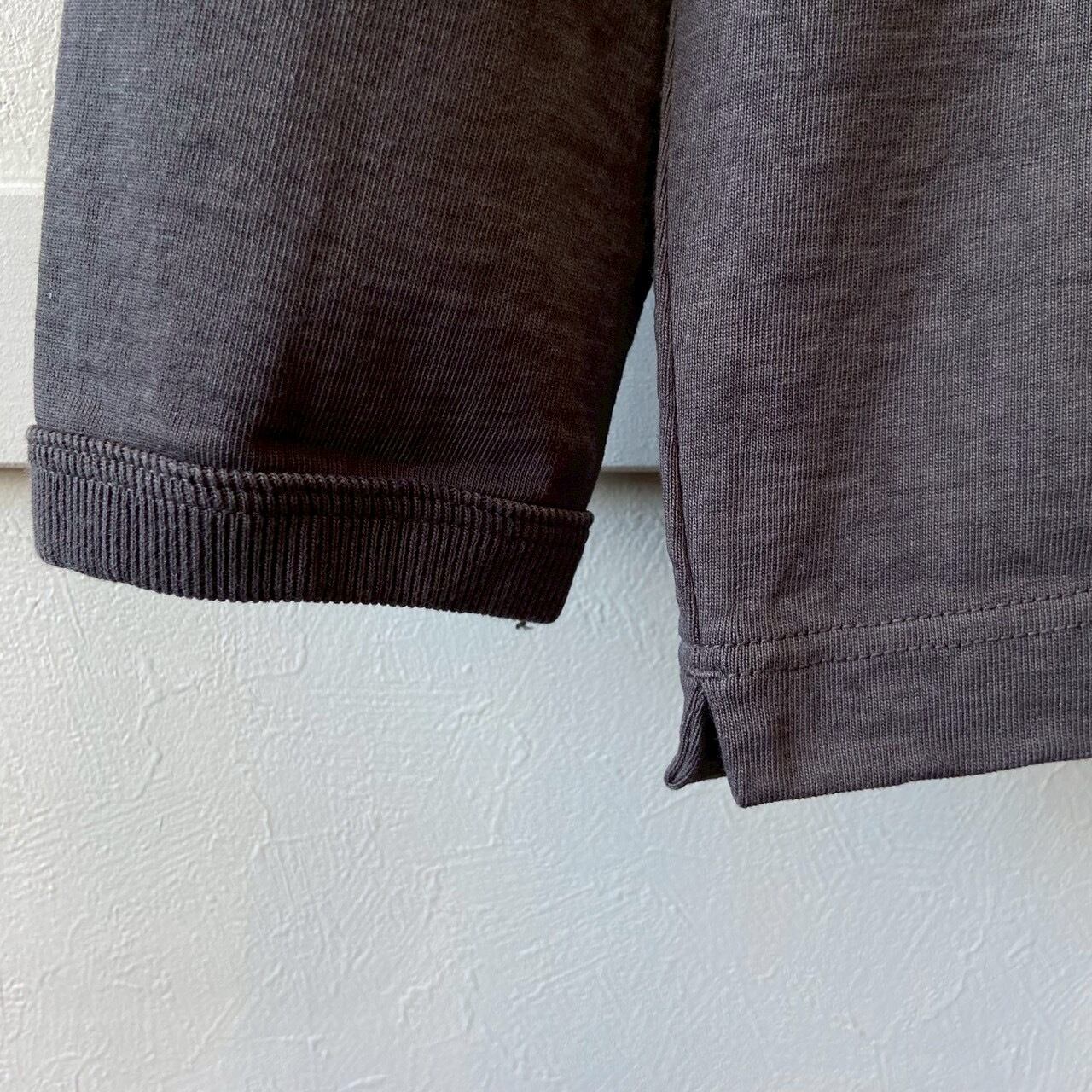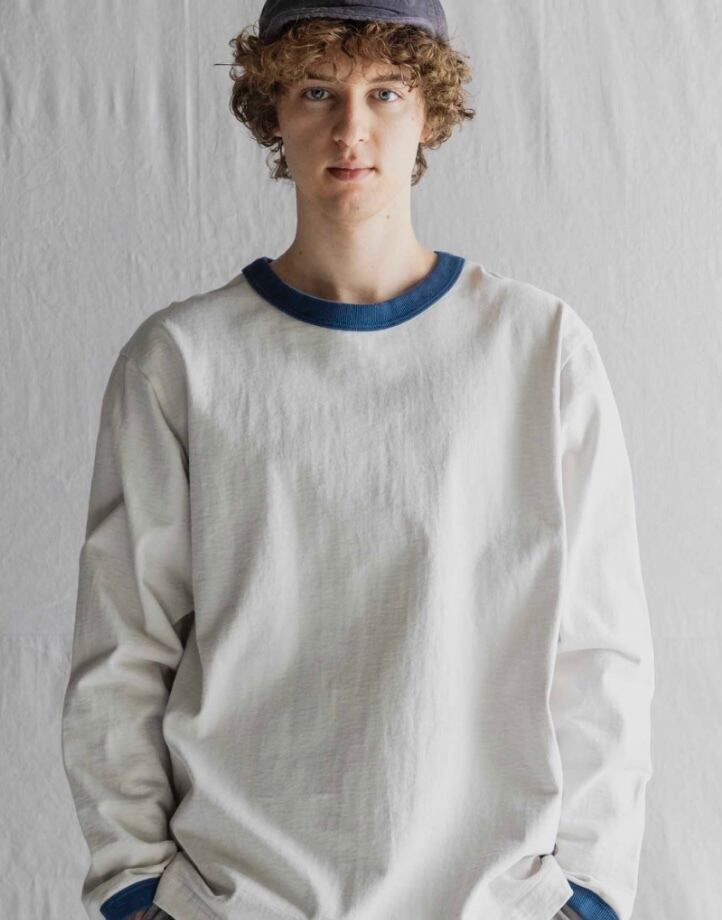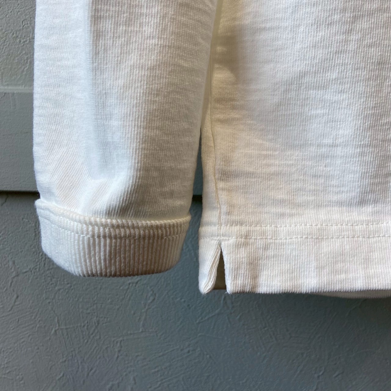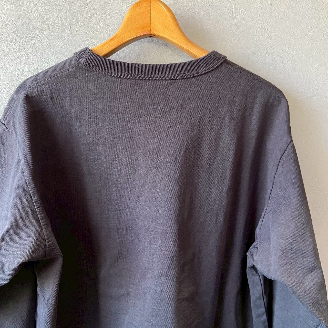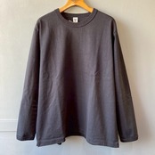 アメリカ産のコットンを使用して吊り編み機で限界まで度目を詰めて編み立てた約11.5オンスの極厚素材「ドツメ天竺」を使用した長袖Tシャツです。身生地に合わせスウエット並みのしっかりした厚みのリブを使用し全体のバランスを整えたこの長袖Tシャツはハリ感もあるので肌へのまとわりつきも少なく春先から着用できます。