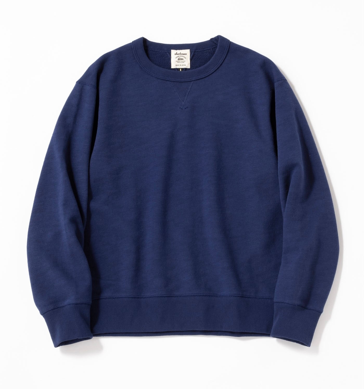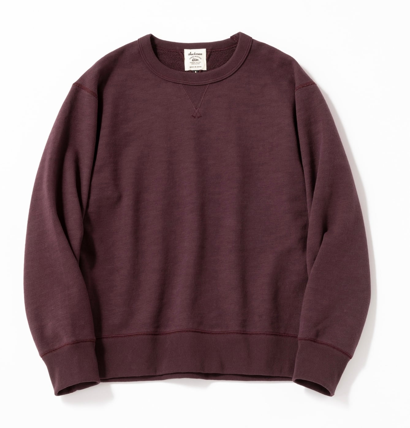 肉厚感のあるスウェット素材「GG裏毛」を使用したクルーネックシャツです。首元、袖口、裾に配したリブも身頃の肉厚感とのバランスを考え2本取りして編み立てることで耐久性を高めました。着用時の快適さを追究した結果、肌に触れる主要部分の縫製は縫い代が平らになり、ごろつき感が少ないフラットシーマを採用。首元のガセット(マチ)は前後に配置して着脱時の伸縮を補助、首のリブが伸び切るのを防止します。頑丈で着込むほどに愛着が湧くスウェットシャツです。
