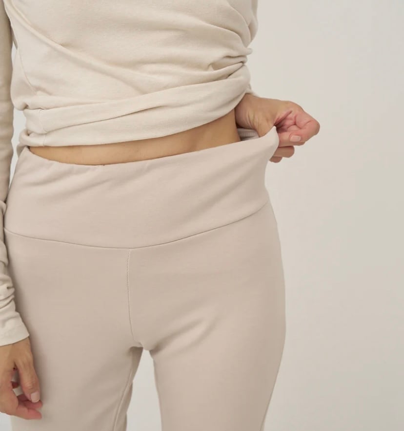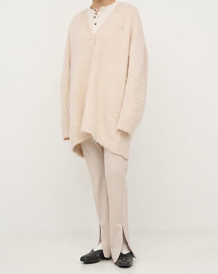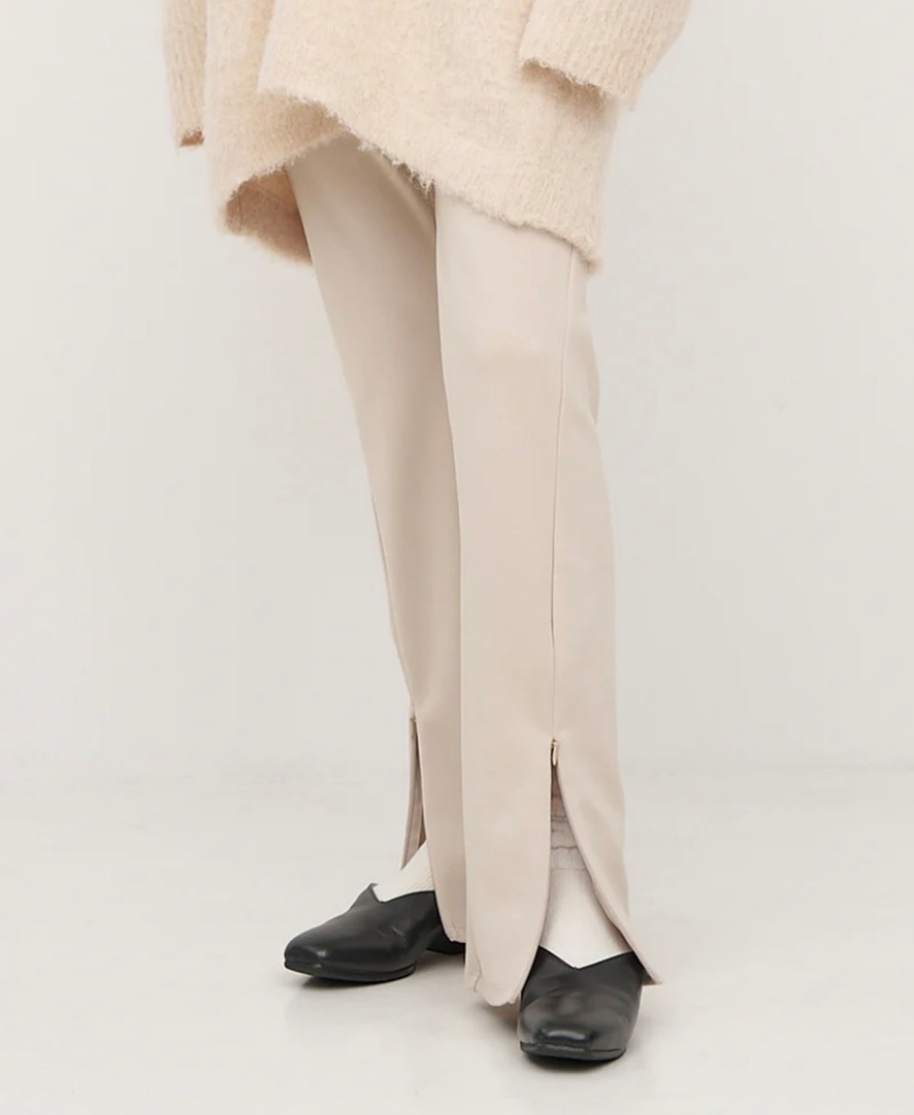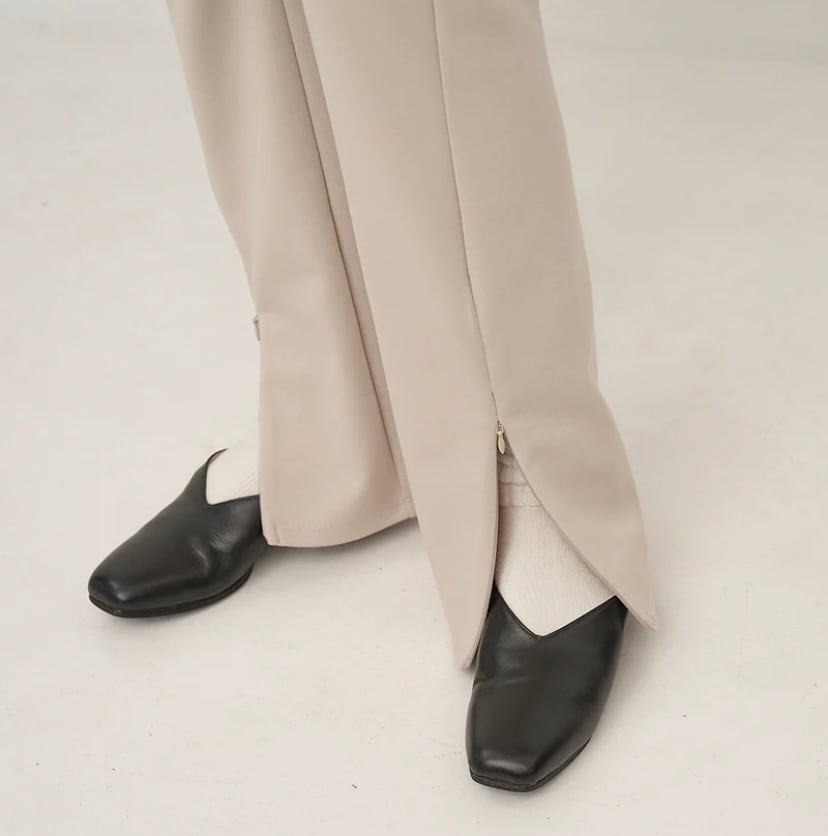 膝から裾にかけてやや広がるフレアラインで、フロントのスリットを開けるとセミフレアシルエットのパンツになります。
