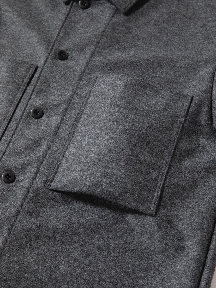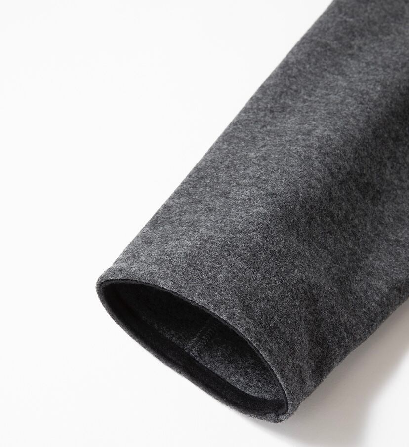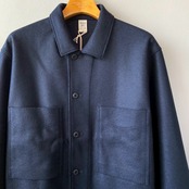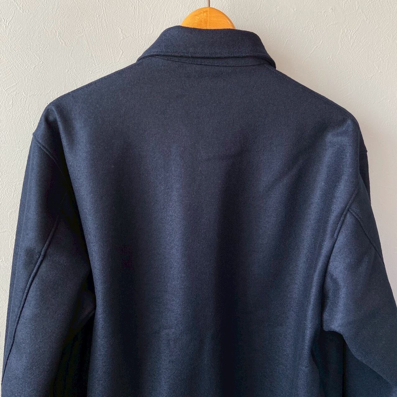 ウールリングヤーンを使用した編地に強力な熱と圧力をかけて加工した素材を使用したBaseballシャツです。リングヤーンは細く強い芯糸に絡み糸を撚り合わせて完成させたリング状の糸で不安定な羊毛を安定させ柔らかな風合いを保つ糸です。この糸で編み立てた素材はウールメルトンのようなハードな風合いと程よい柔らかさ、丸みを帯びた表情を作ります。デザインはBaseballユニフォームに襟がついていた時代のデザインをベースにアウターとしての機能を考え大振りのポケットを配しました。