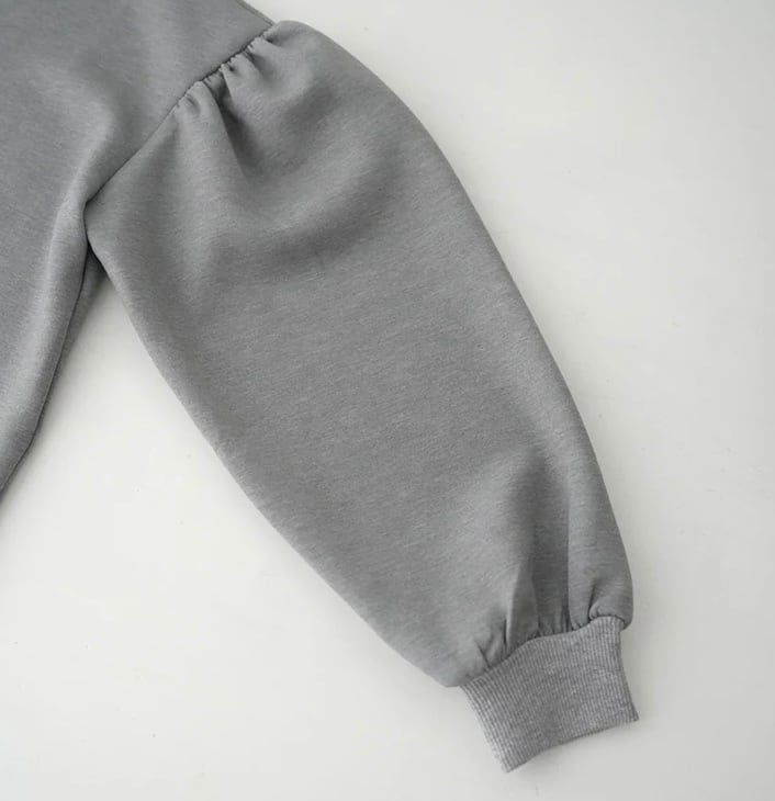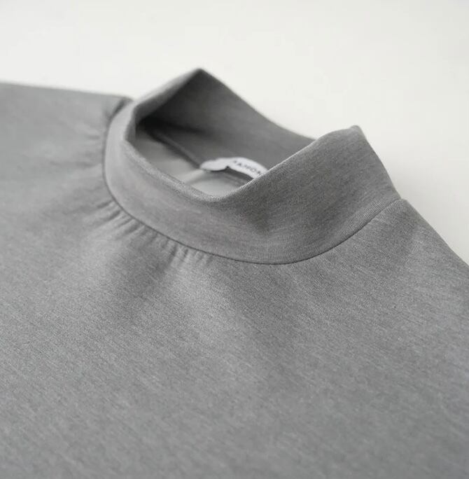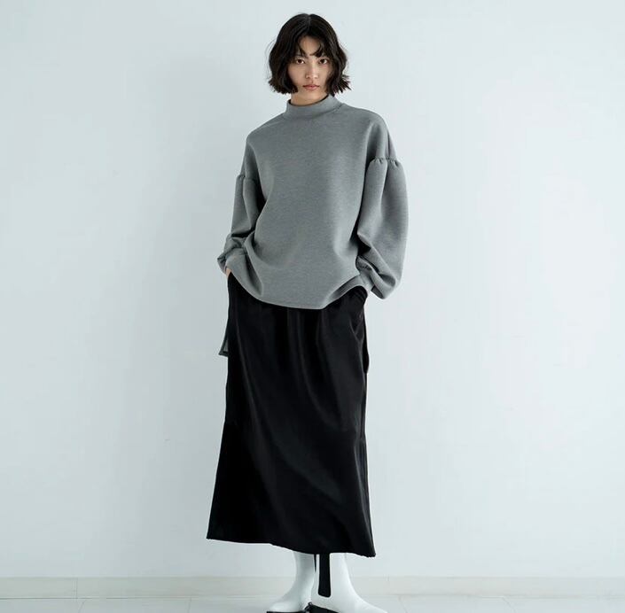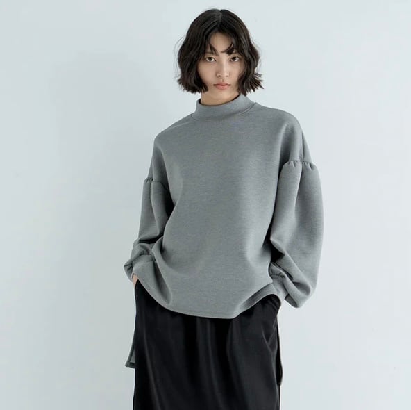 アームホールや袖口のギャザーで女性らしいシルエットが特徴のモックネックのチュニック丈カットソーです。