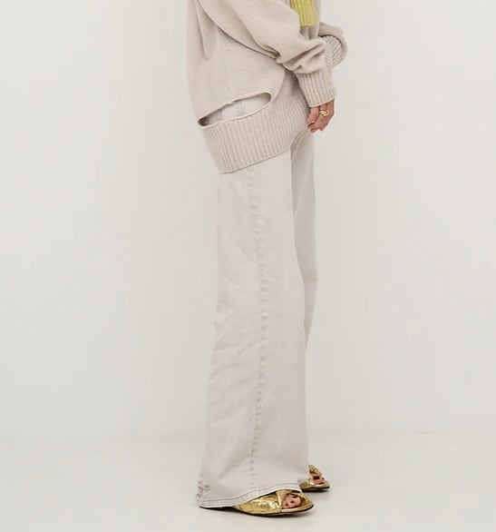 膝上から少しずつ広がるフレアシルエットを採用したデニムパンツです。11.5ozのデニム生地を使用、ミディアムウェイトでオールシーズン着用いただける厚みの生地です。 太ももがフィットしているデザインが多いフレアデニムですが、ヒップや太ももを若干ルーズにゆとりを持たせてメリハリはあえて無くすことで、大人の方にも着やすい、こなれた印象のフレアデニムに仕上げました。 脛辺りに施したセンタープレス風の擦りデザインや、膝位置の設定を少し高めに設定することで、膝下を長く見せる効果に。 前はすっきりと大人っぽく、後にはダメージデザインを所々に入れて遊びをプラスしています。 定番のデニムカラーと、製品染め加工で出す絶妙なグレーベージュカラーの展開です。