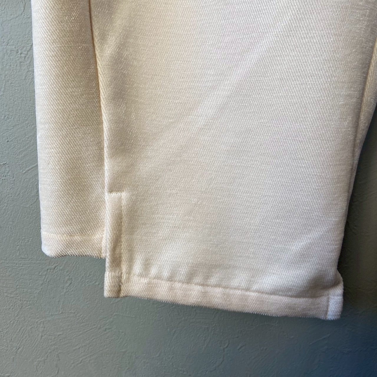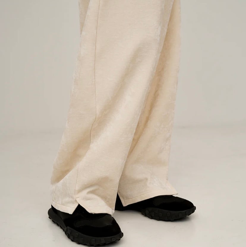 昨年実績のMOLE TWILL CURVE PTです。毛足のあるモール糸で織られたツイル生地を使用、なめらかな肌触りとベロアのような上品な光沢が特徴です。脇の切り替えを利用した正面に向かってカーブを描くパターンになっていて、膝あたりで膨らむ自然なコクーンシルエットになるよう設計されています。裾脇に入ったスリットは足の甲に乗って開くようにデザインされていて、パンツの裾を引きずらないように前は長く後は少し短めに設定しています。しっかりとした暖かみのある素材で作るデザインパンツは機能性とデザイン性を備えた、寒い季節におすすめの1枚です。