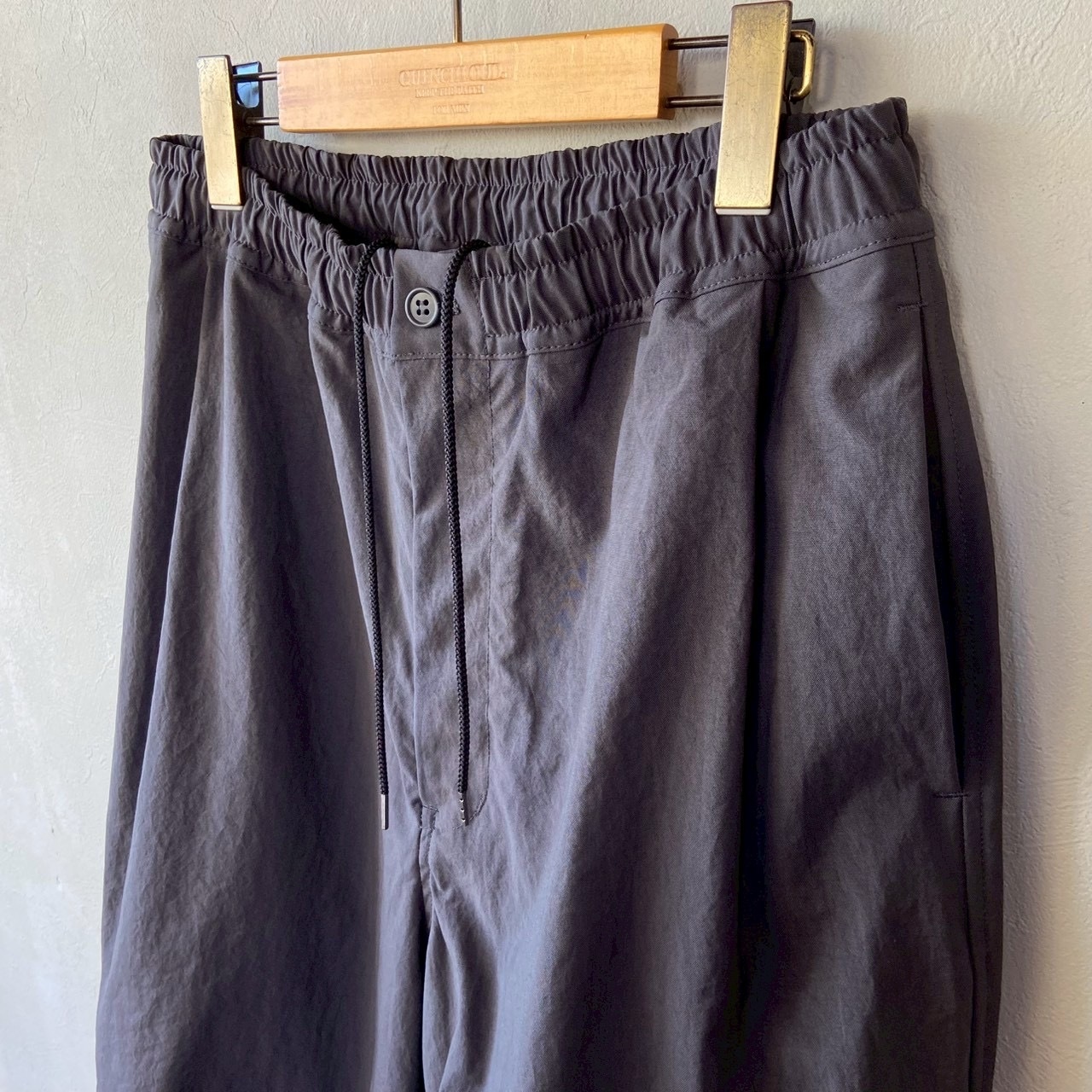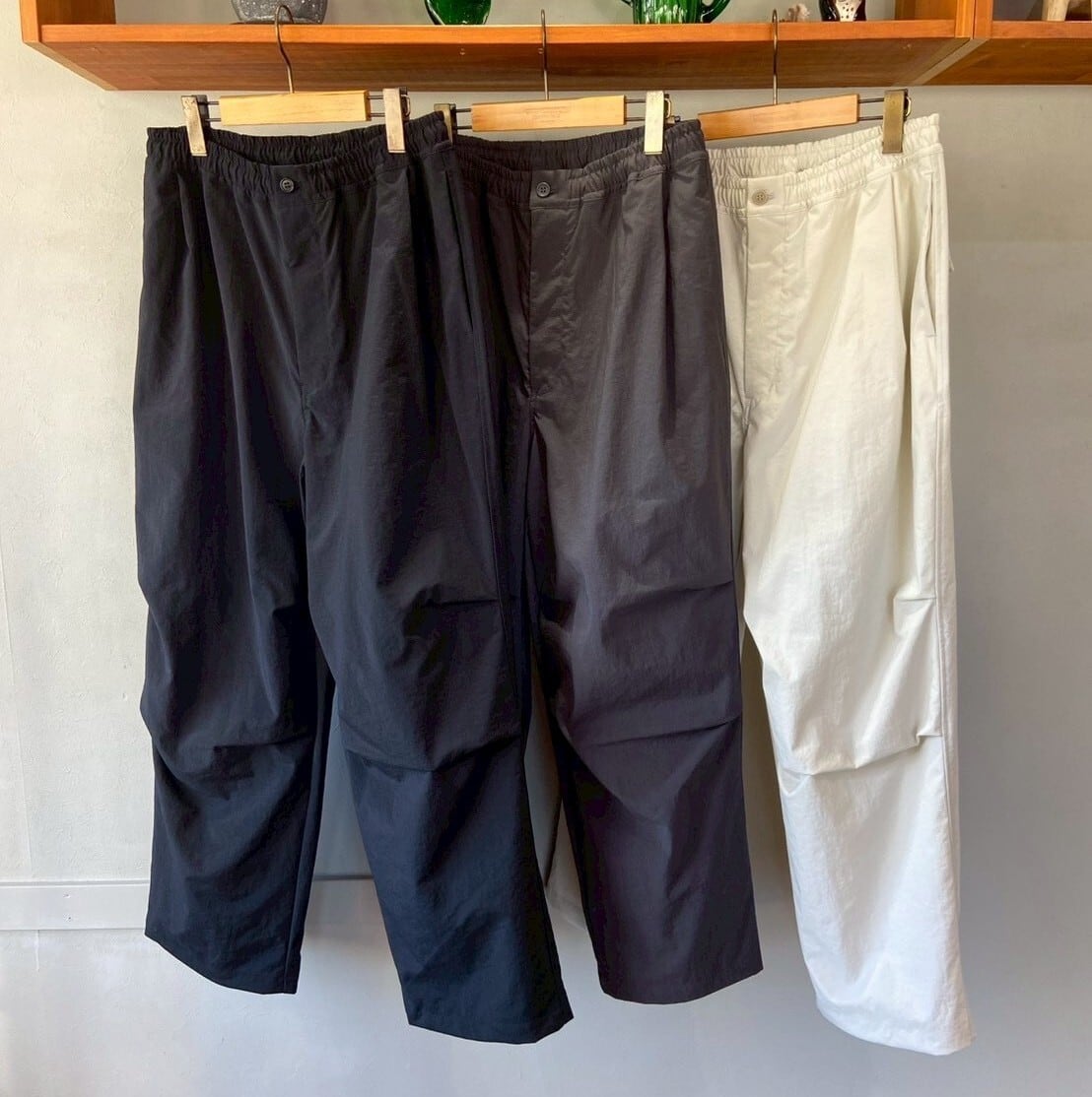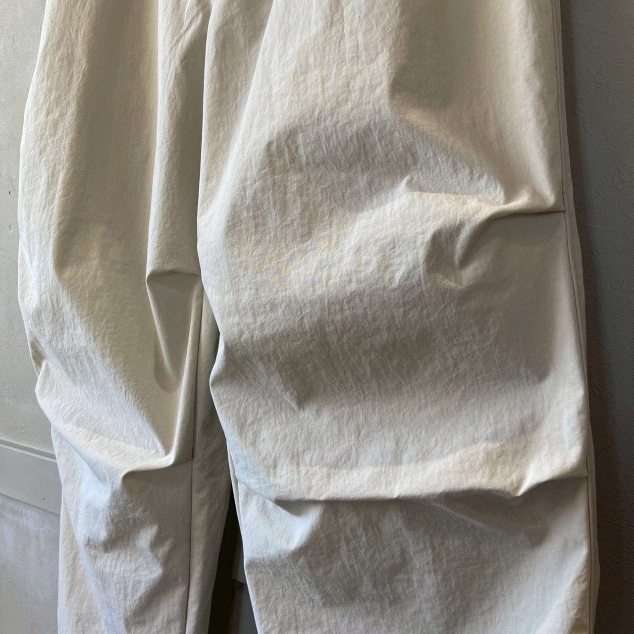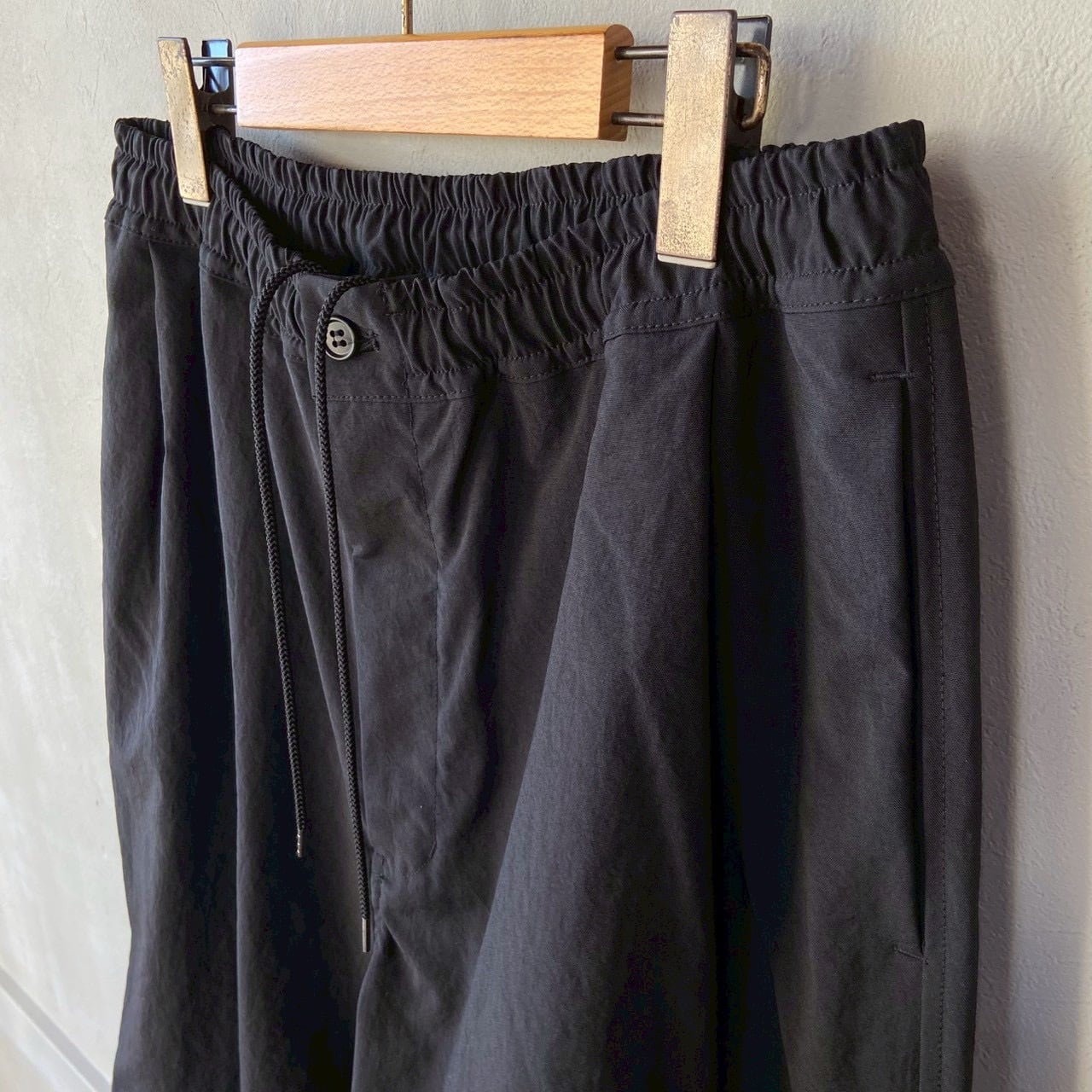 タスランナイロンを使用した天然素材のように見える生地を使用したニータックパンツ。ウエストに平ゴムを叩きつけた仕様でベルトループはなく、スピンドルで絞って履いていただくタイプです。今回のコレクションの中ではワイドシルエットのパンツです。