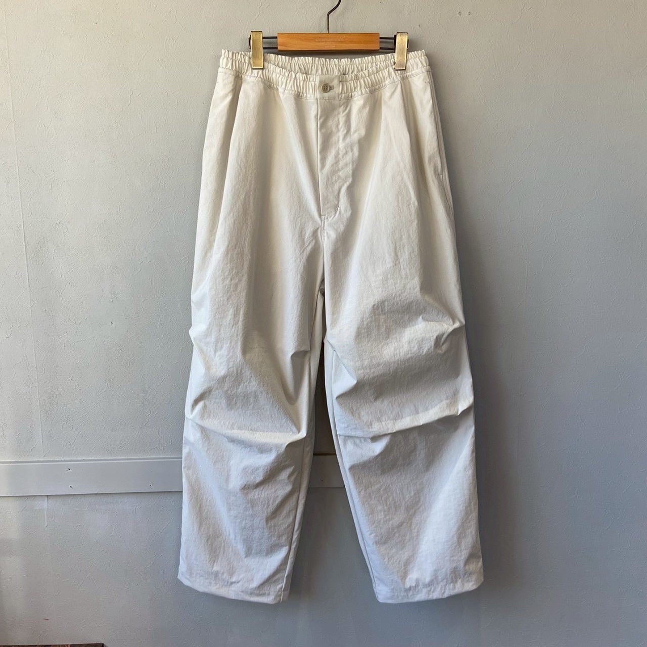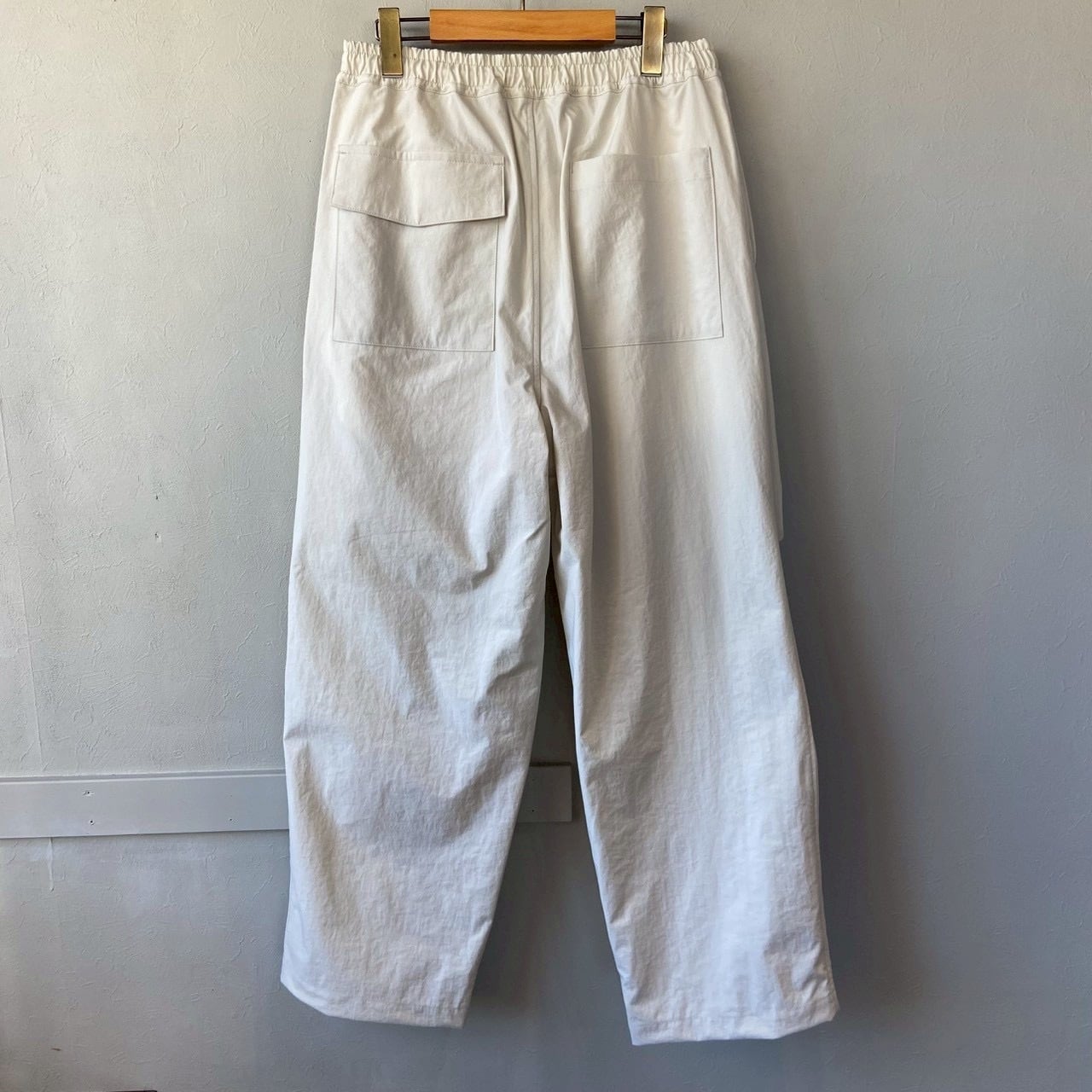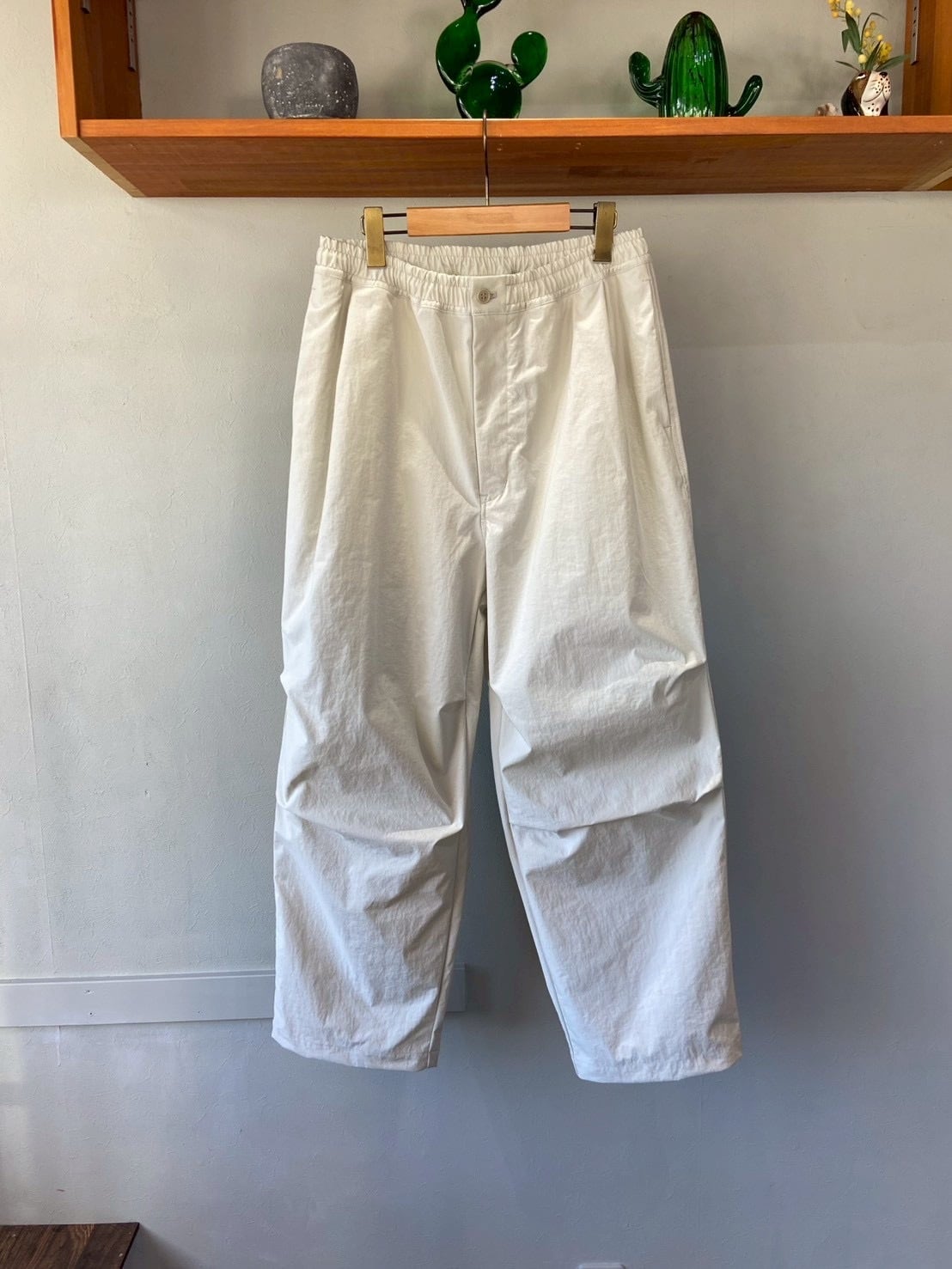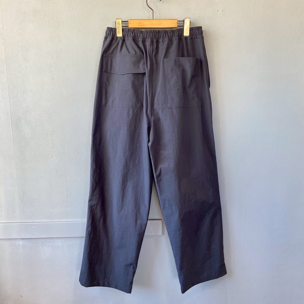 タスランナイロンを使用した天然素材のように見える生地を使用したニータックパンツ。ウエストに平ゴムを叩きつけた仕様でベルトループはなく、スピンドルで絞って履いていただくタイプです。今回のコレクションの中ではワイドシルエットのパンツです。