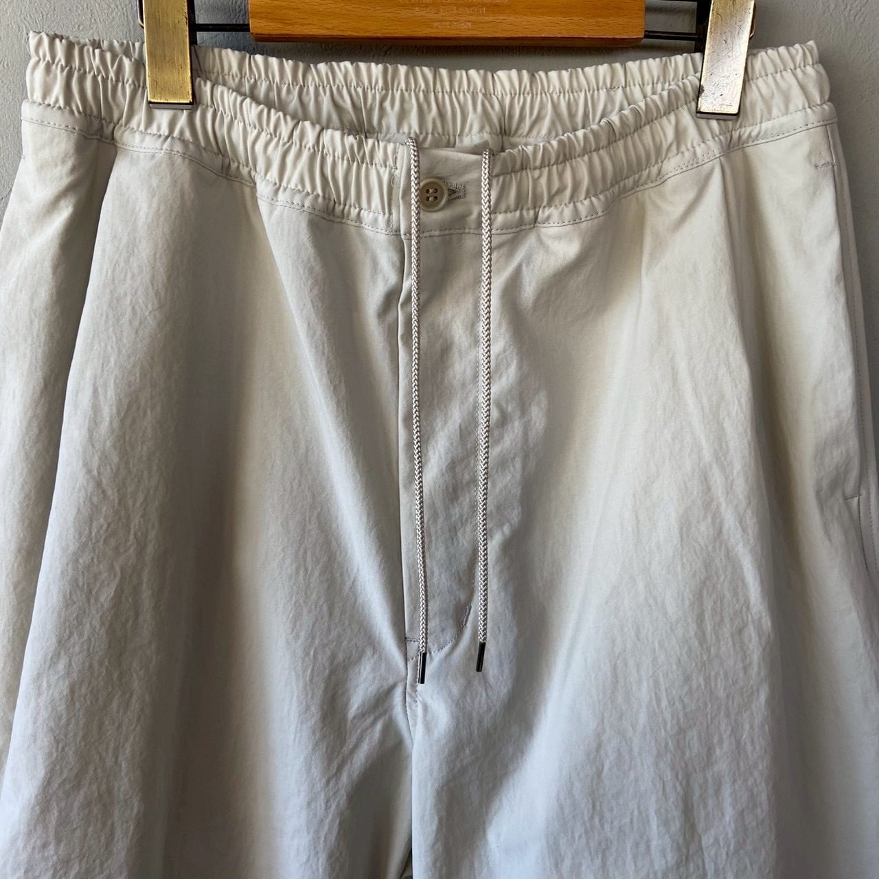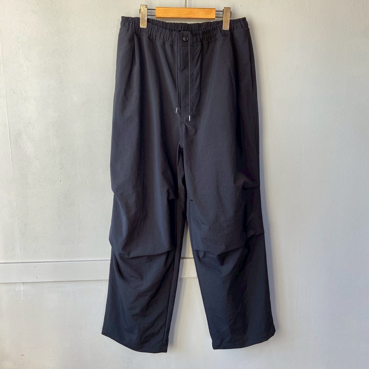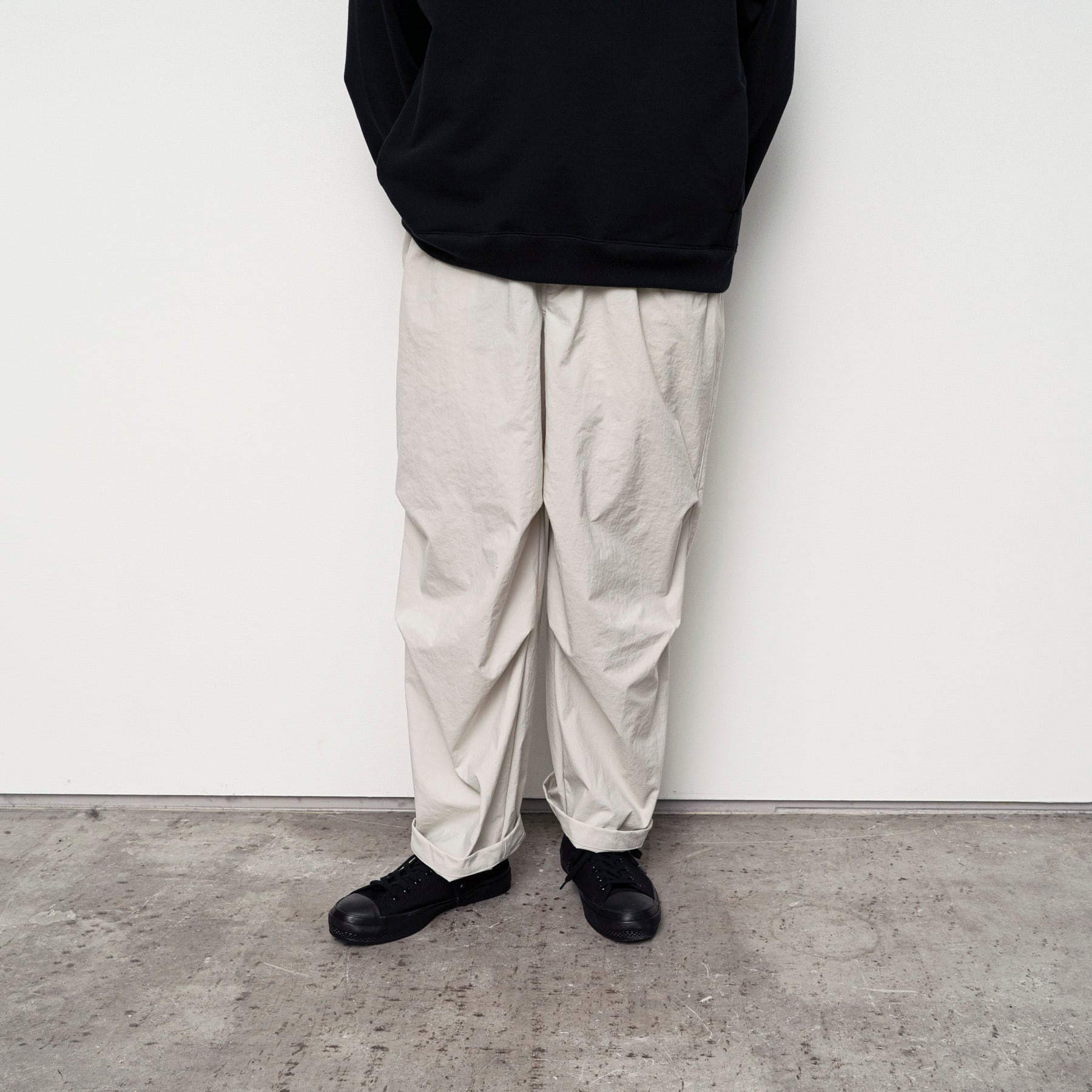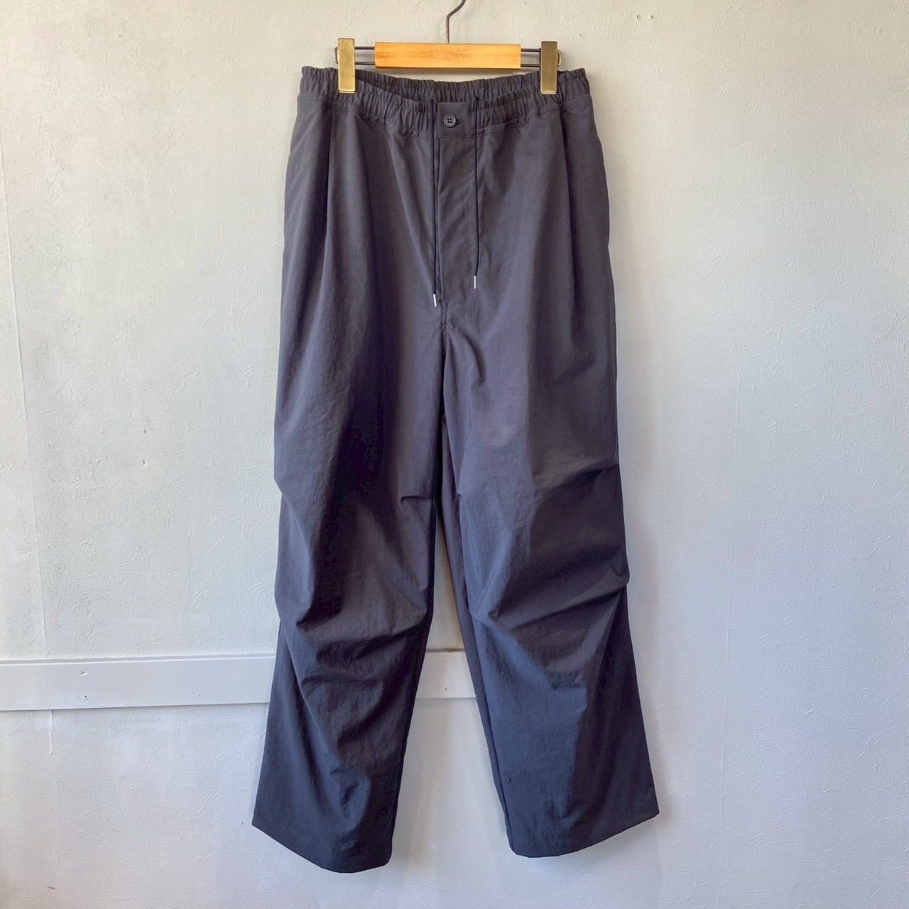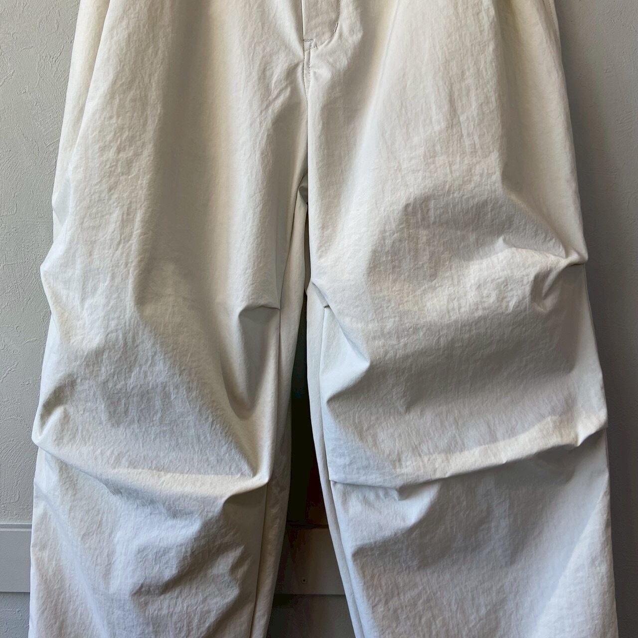 タスランナイロンを使用した天然素材のように見える生地を使用したニータックパンツ。ウエストに平ゴムを叩きつけた仕様でベルトループはなく、スピンドルで絞って履いていただくタイプです。今回のコレクションの中ではワイドシルエットのパンツです。
