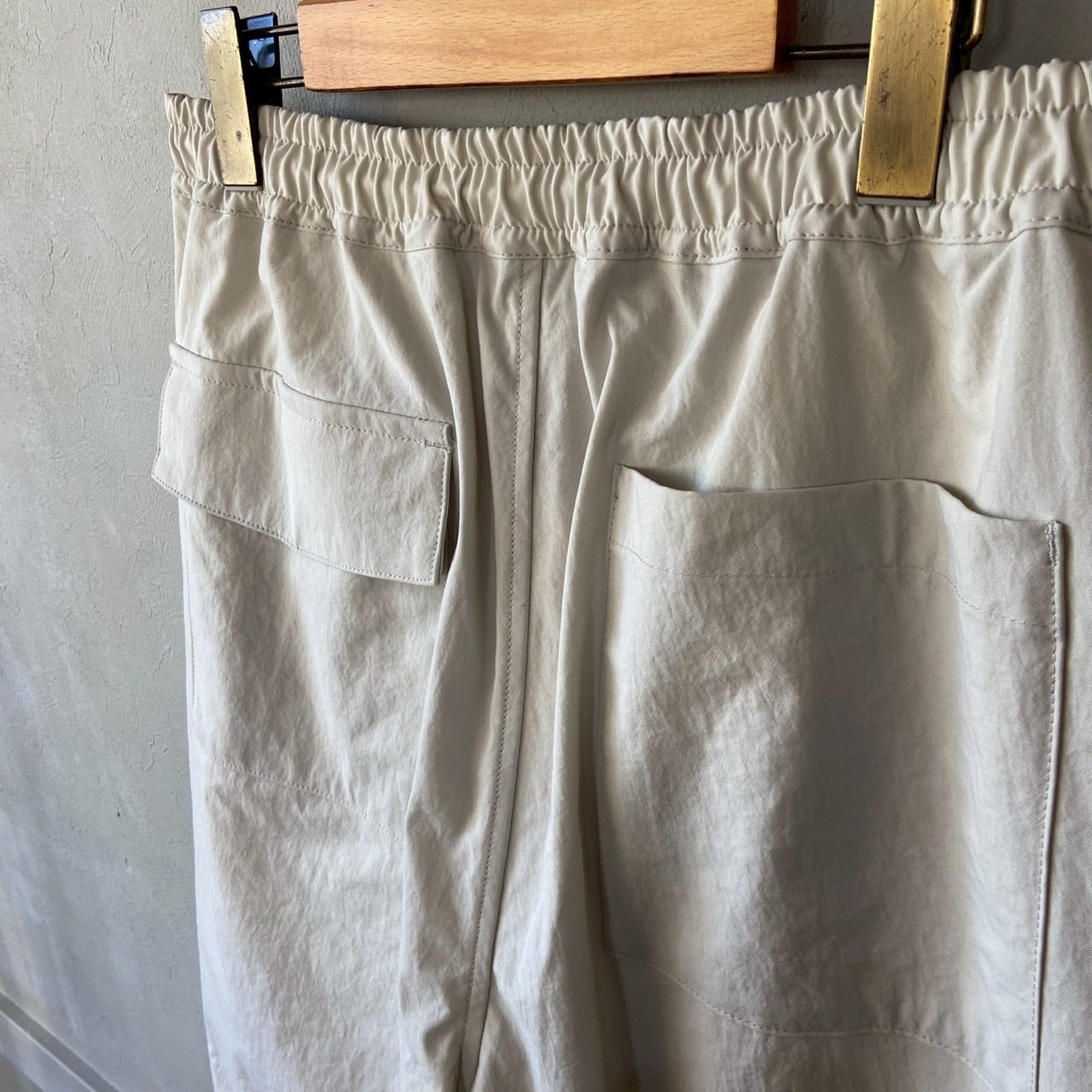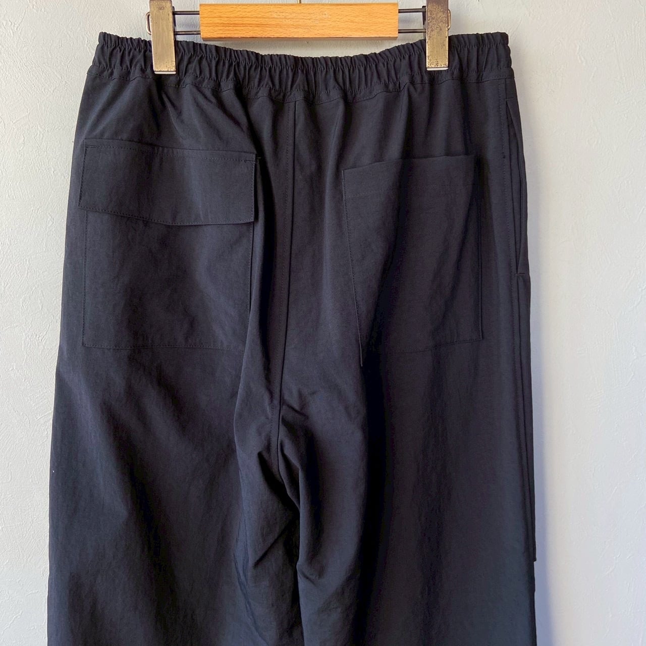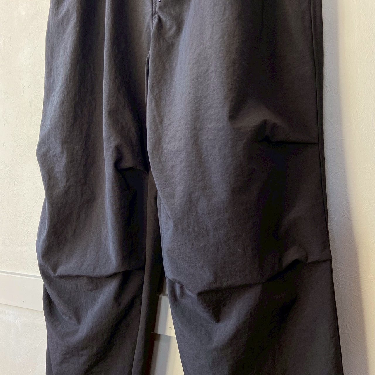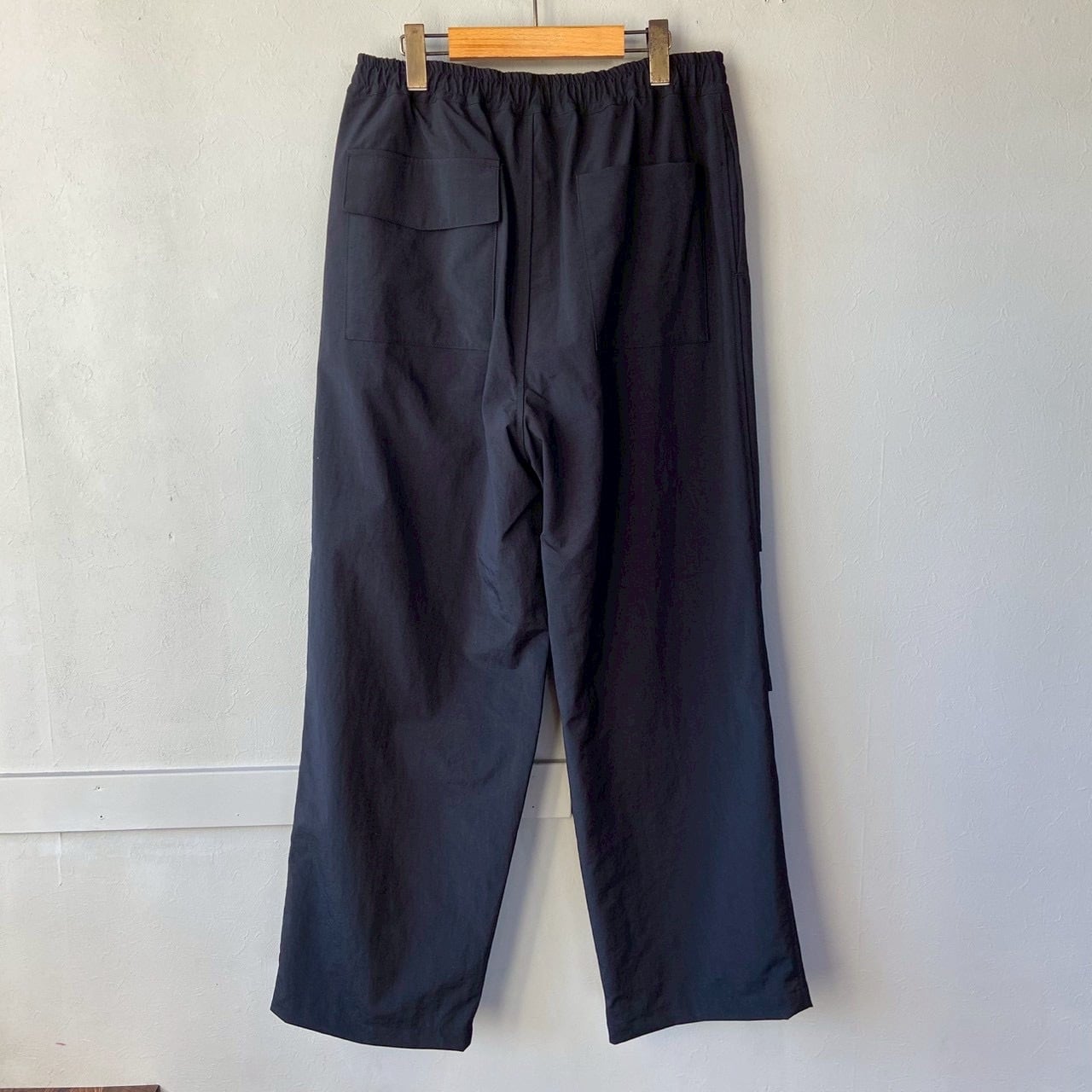 タスランナイロンを使用した天然素材のように見える生地を使用したニータックパンツ。ウエストに平ゴムを叩きつけた仕様でベルトループはなく、スピンドルで絞って履いていただくタイプです。今回のコレクションの中ではワイドシルエットのパンツです。
