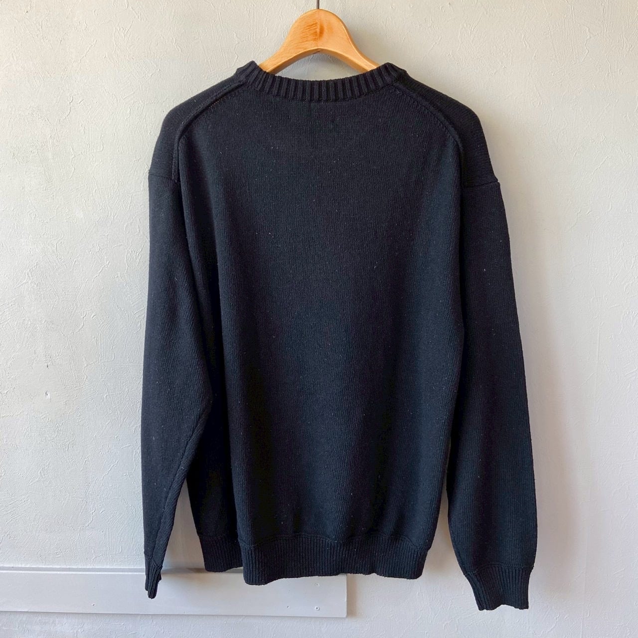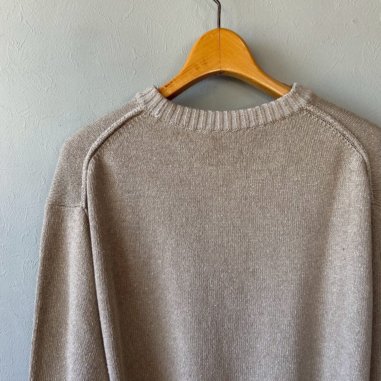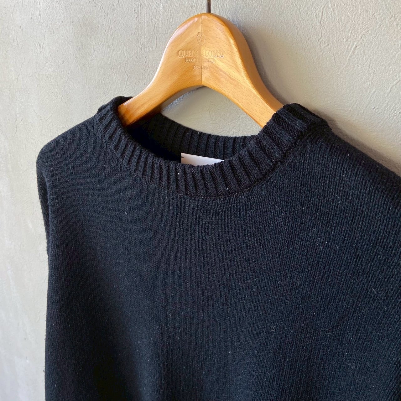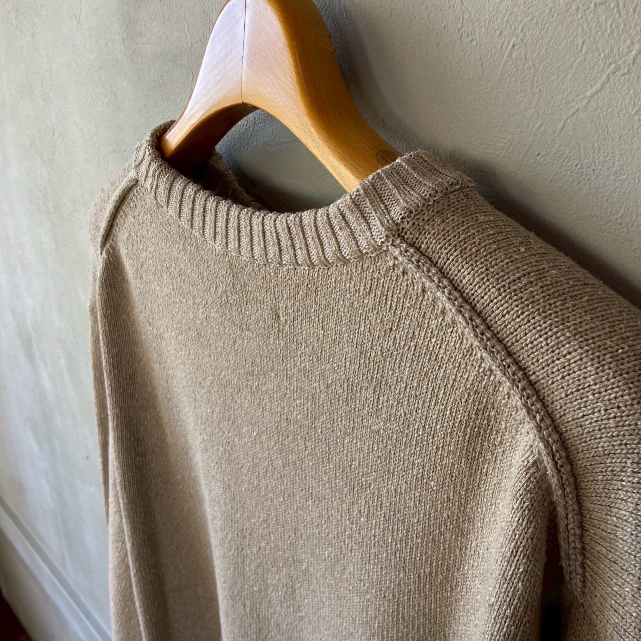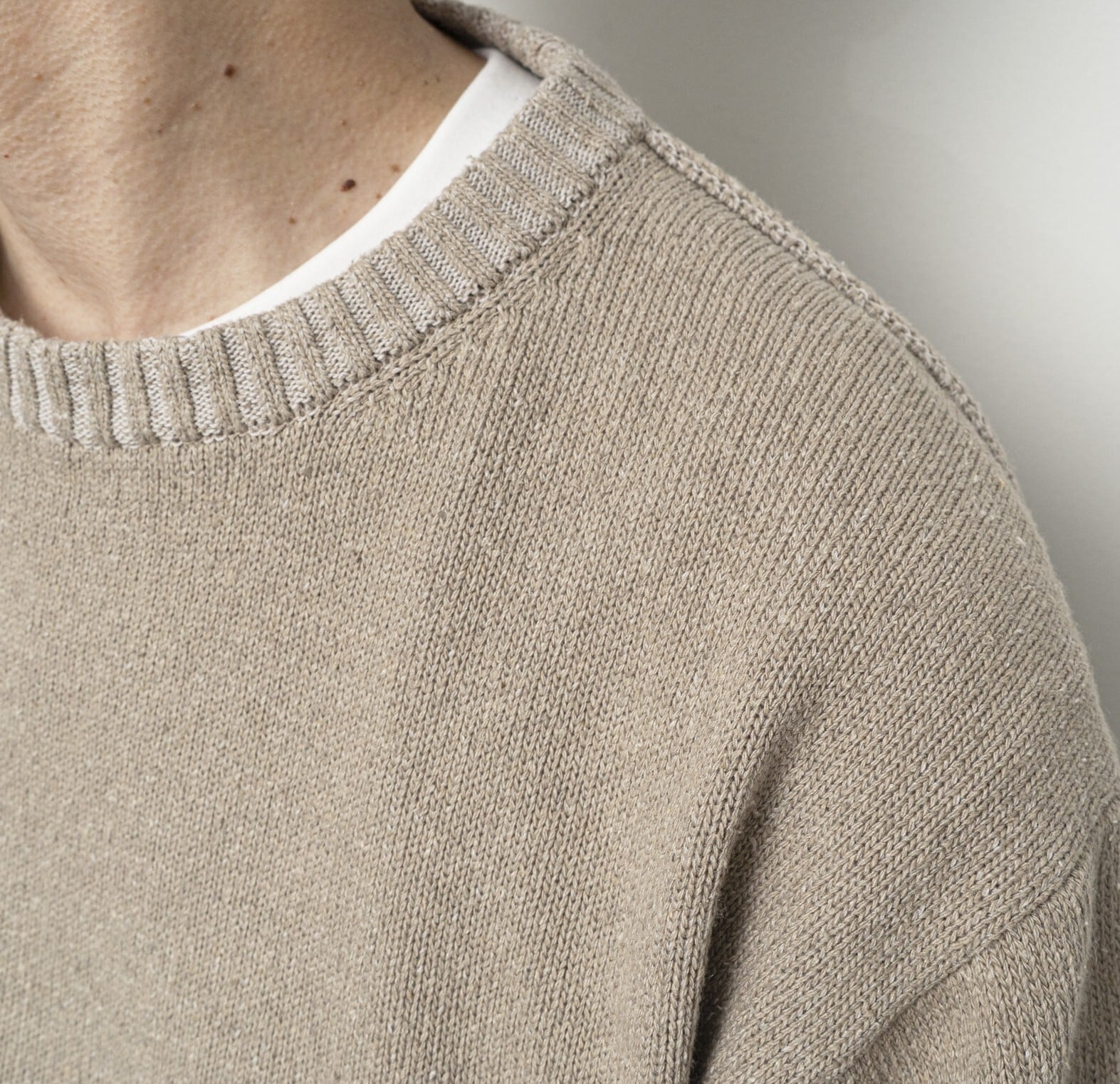 太番手のネップ感のあるローシルクを表に肌に触れる側には少しハリ感のある綿糸をプレーティング編みした丸首プルオーバーニット。7G天竺の編み地で少し厚手のニットで今回は春の立ち上がりニットでの提案ですが、夏以外年中着て頂けるニットだと思います。