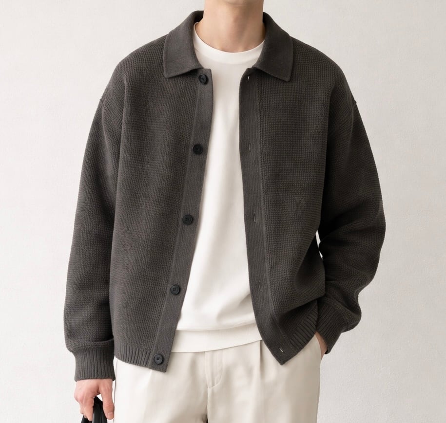 ポリエステル和紙の混紡糸で7Gニットブルゾンを作製しました。