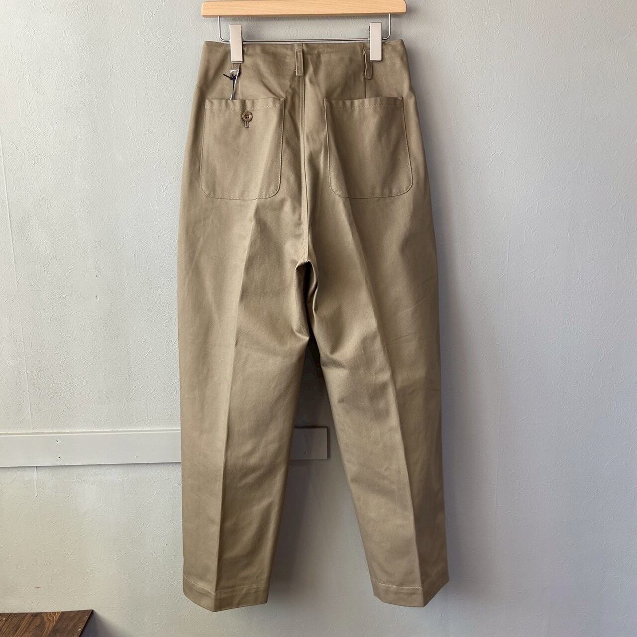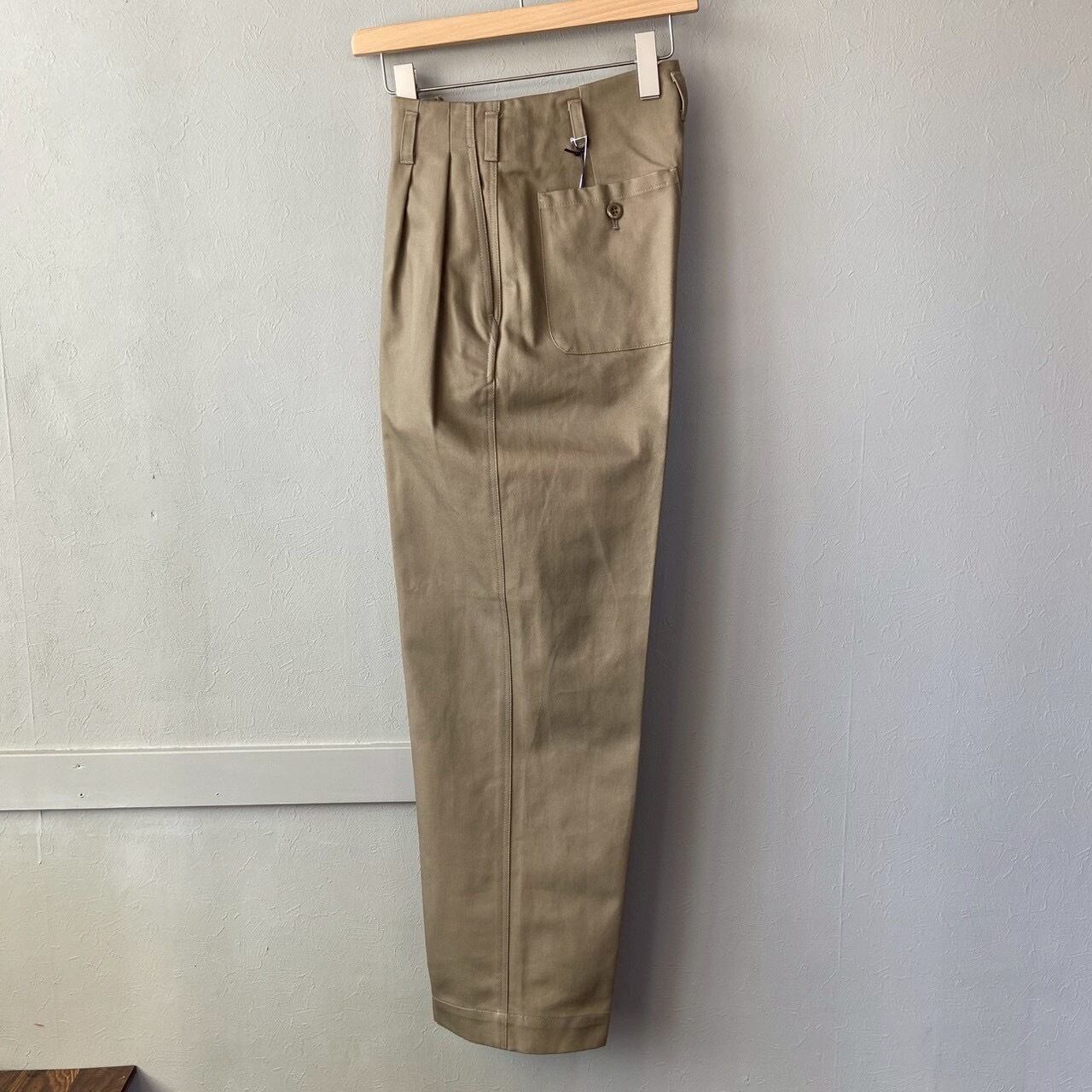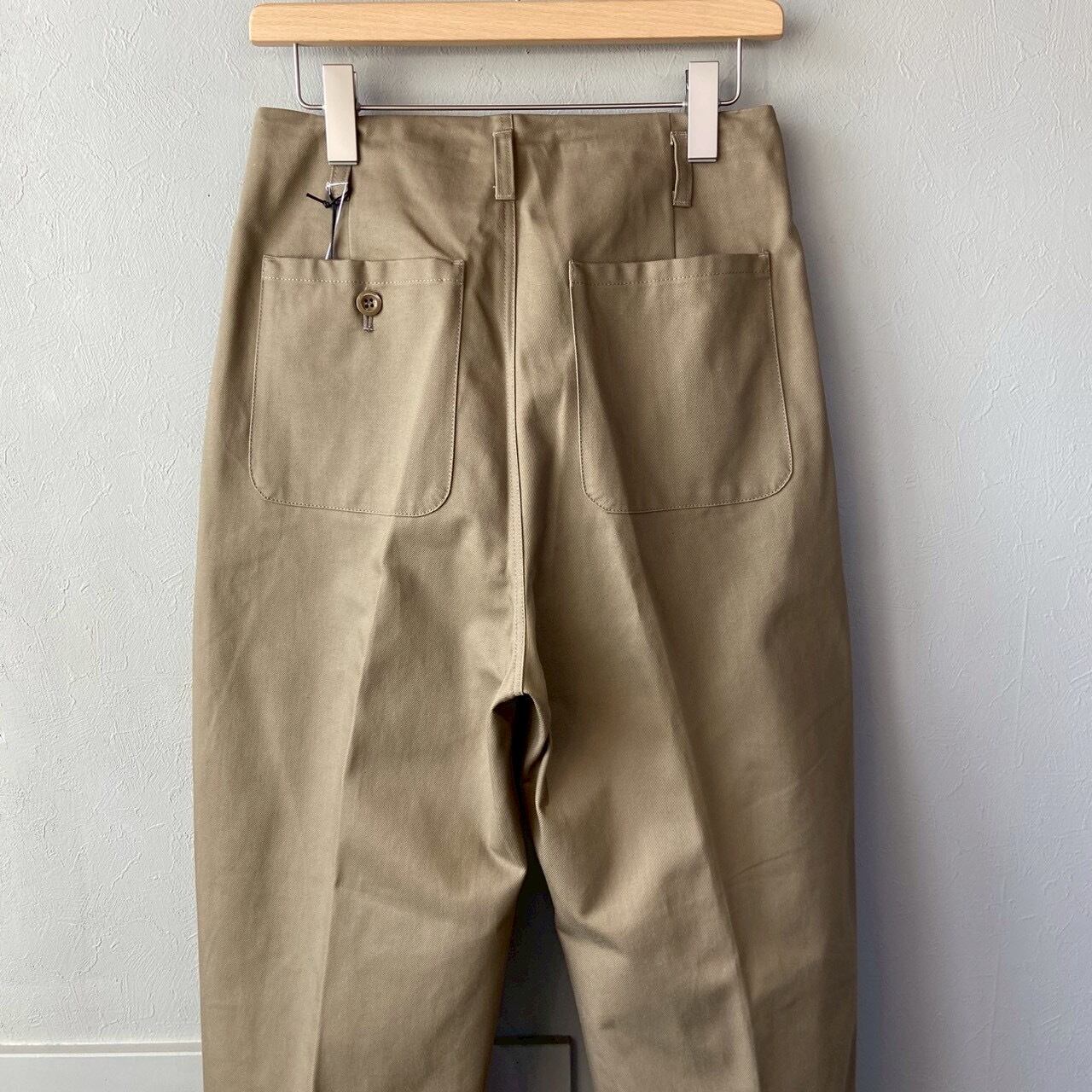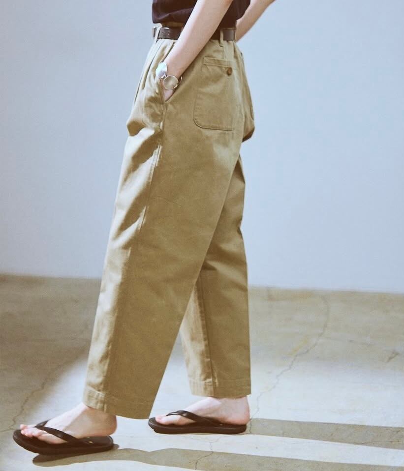 40~50年代の原型を踏まえつつ腰帯と身頃を一体化させた一本。2タックで腰回りにゆとりを持たせ、裾へ細くなるテーパードが大人のバランスをつくる。60年代フランス軍チノの素材を復刻し、染料顔料染めを施したカジュアルからきれいめまで幅広く活躍するパンツ。