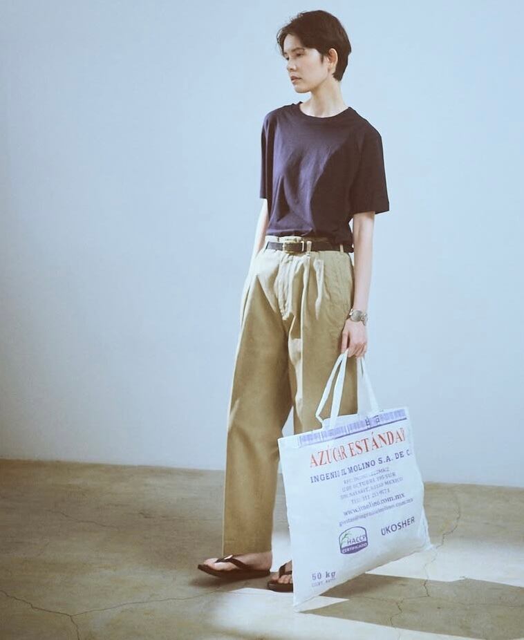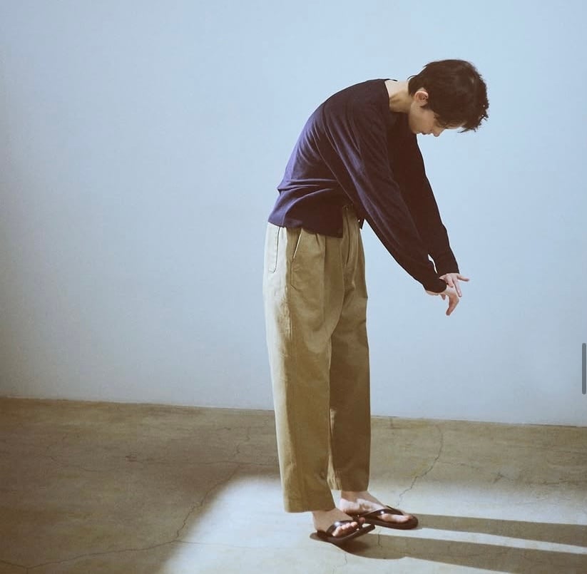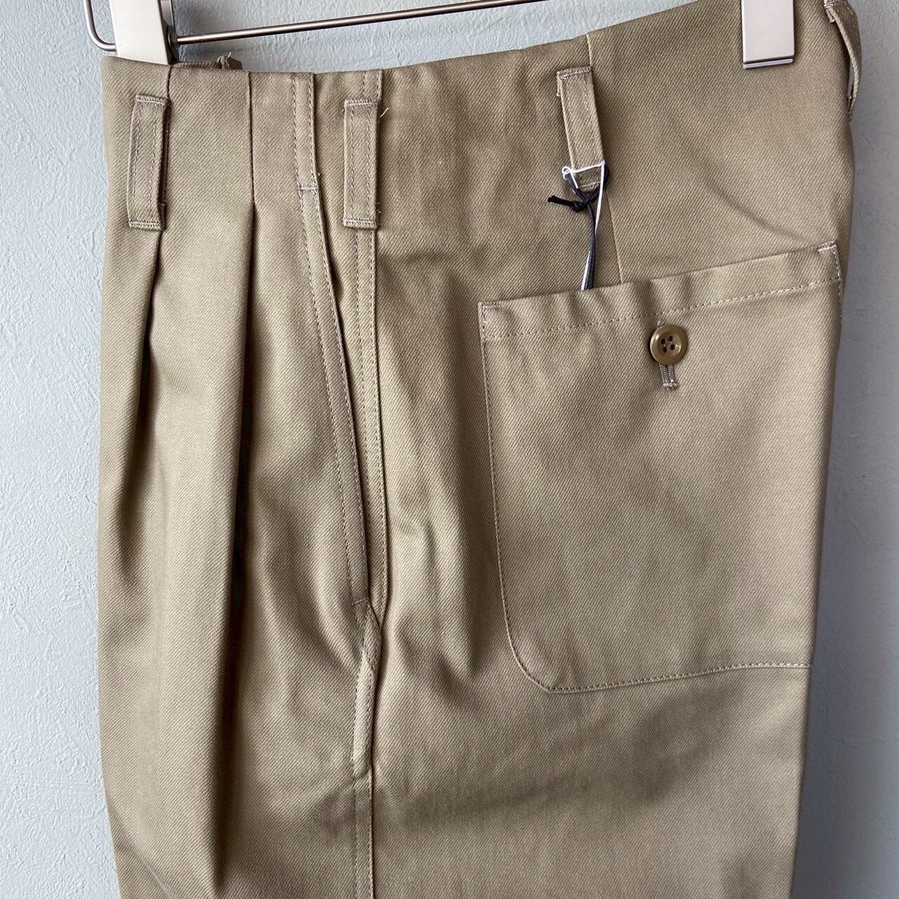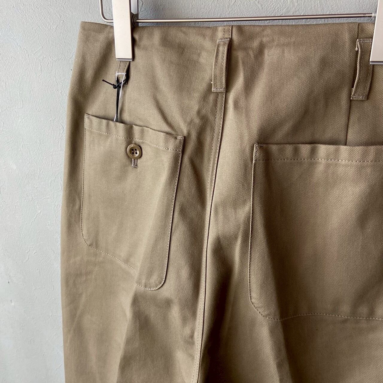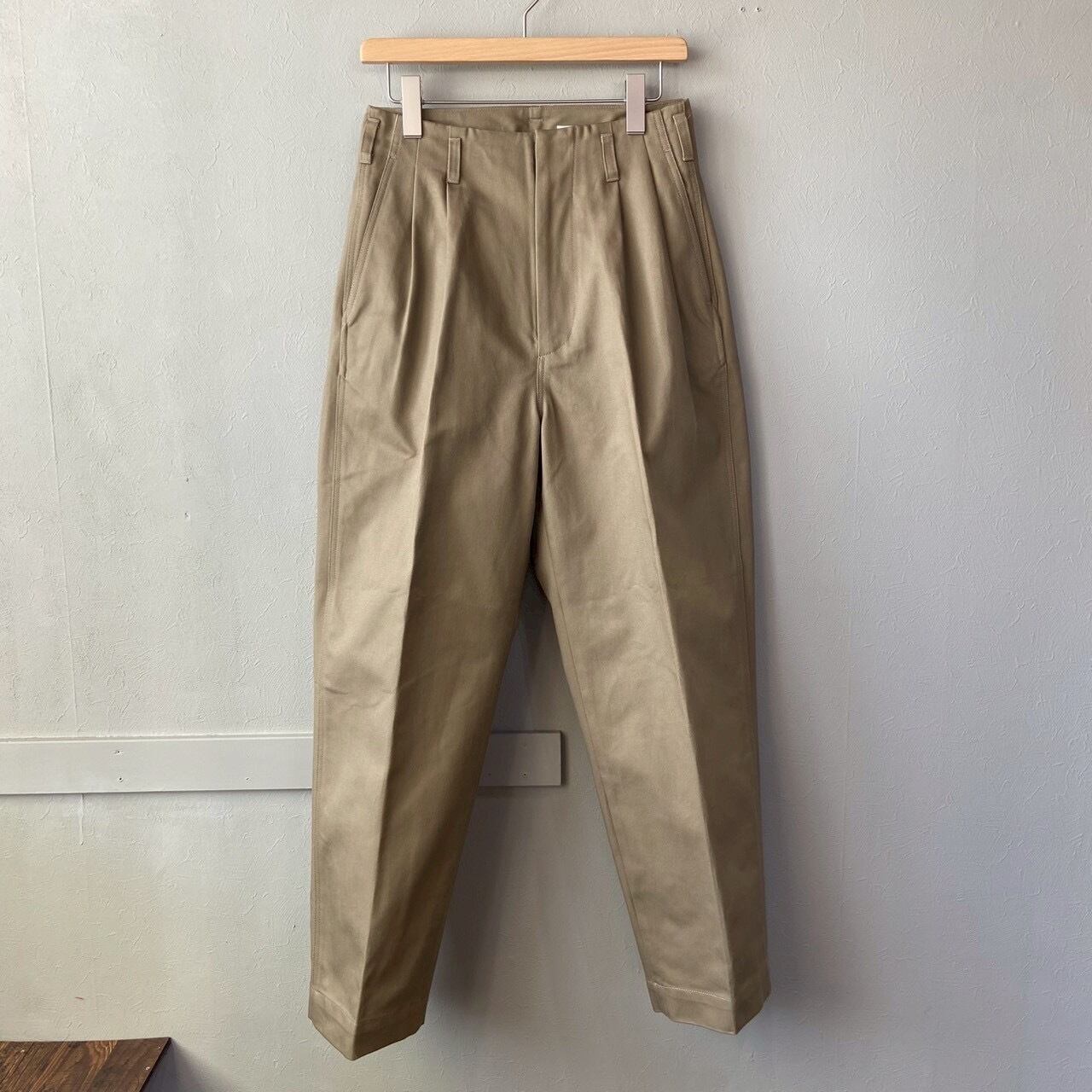 40~50年代の原型を踏まえつつ腰帯と身頃を一体化させた一本。2タックで腰回りにゆとりを持たせ、裾へ細くなるテーパードが大人のバランスをつくる。60年代フランス軍チノの素材を復刻し、染料顔料染めを施したカジュアルからきれいめまで幅広く活躍するパンツ。