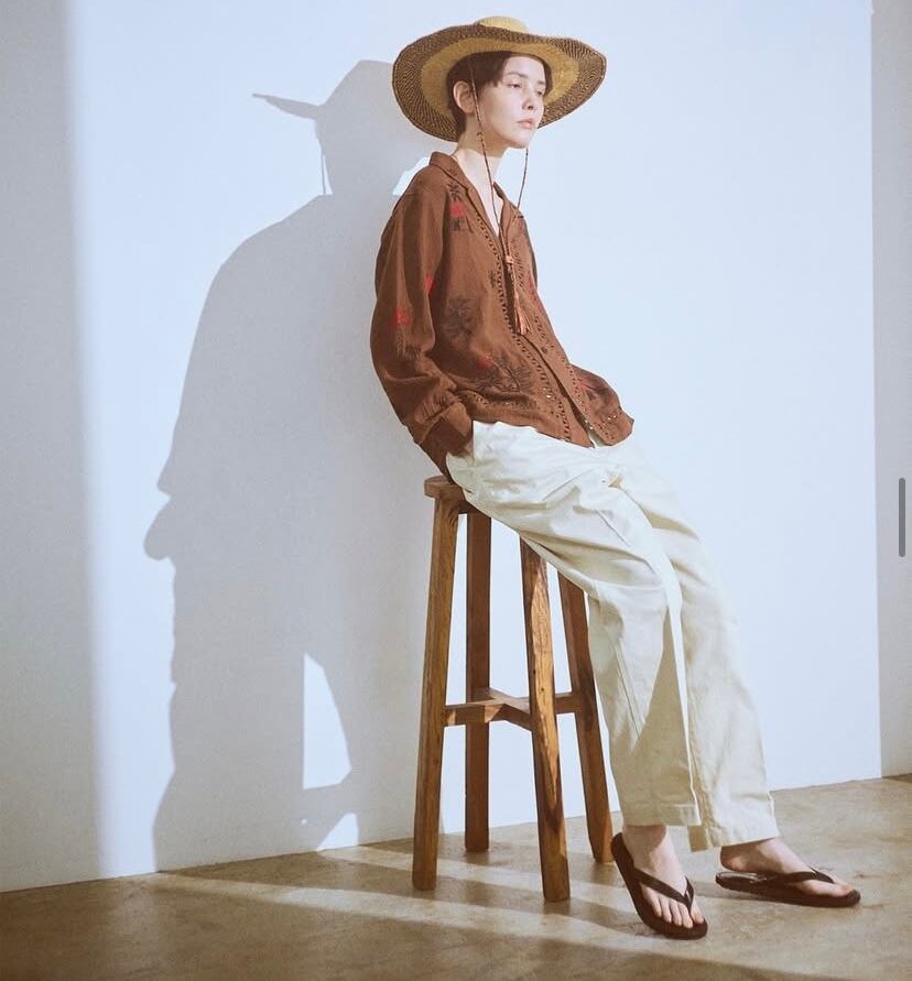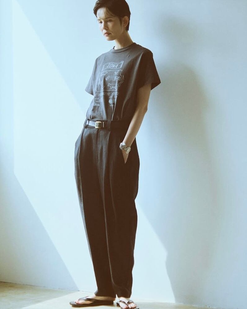 レトロなスウェットに、トラウザーズを合わせた、品のあるリラックスカジュアル。腰回りに余裕を持たせつつ裾にかけてテーパードするパンツの形が全体をすっきり整え、ラフさときちんと感が両立しています。足元を軽くまとめることでパンツの立体的なシルエットが際立ち、素材感とラインの良さが自然に伝わるスタイリングです。