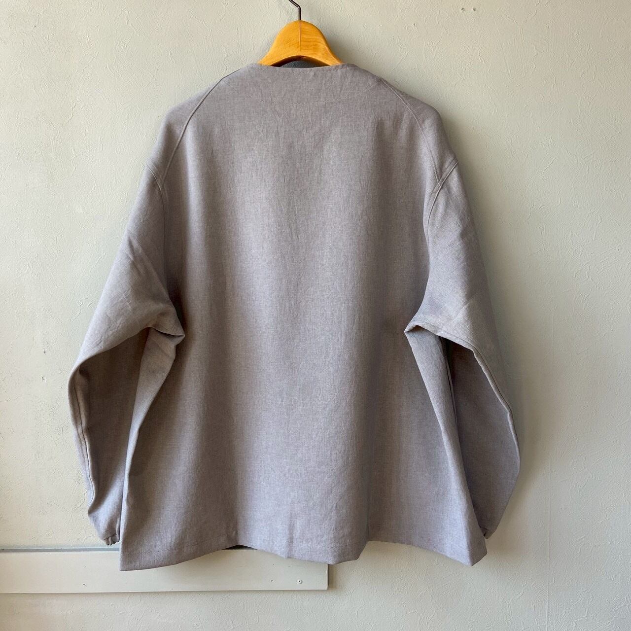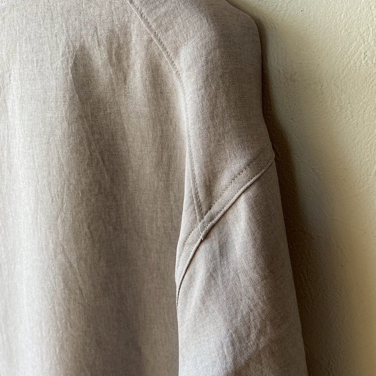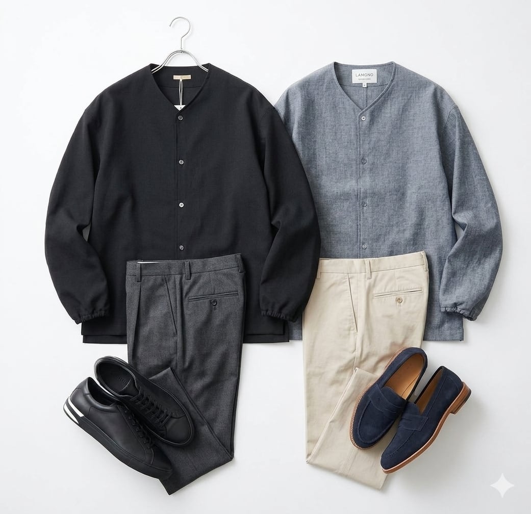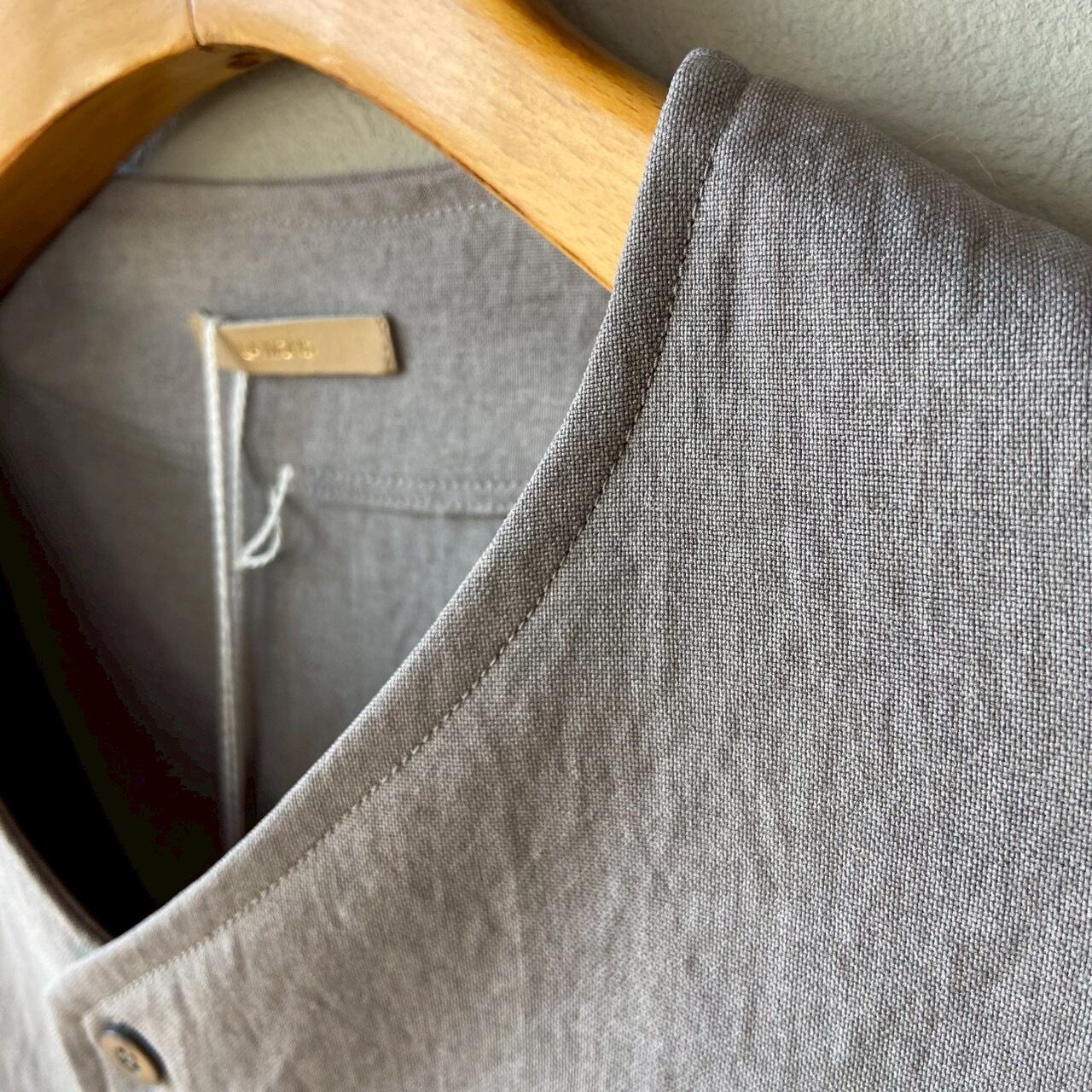 裏地を省いた一重の「軽量仕立て」のため、着心地はまるでシャツのように軽やかです。しかし、首元のスッキリしたノーカラーデザインが、カーディガンよりも端正で、ジャケットよりも気負わない絶妙な立ち姿を演出します。