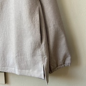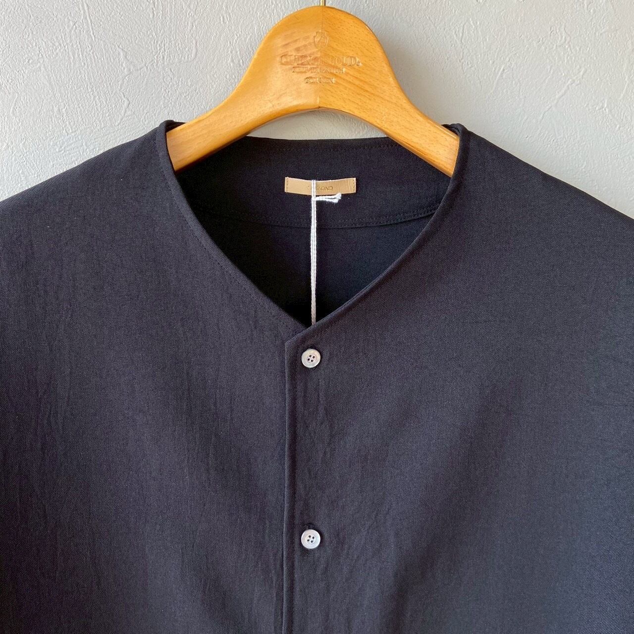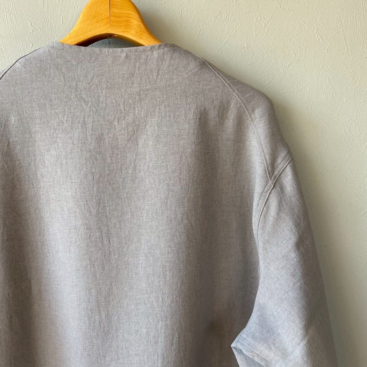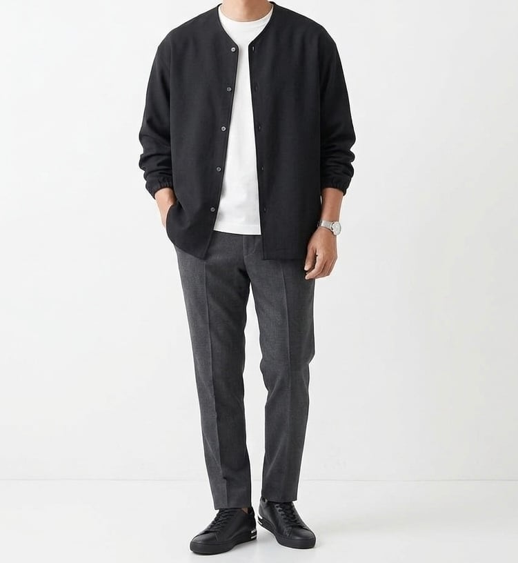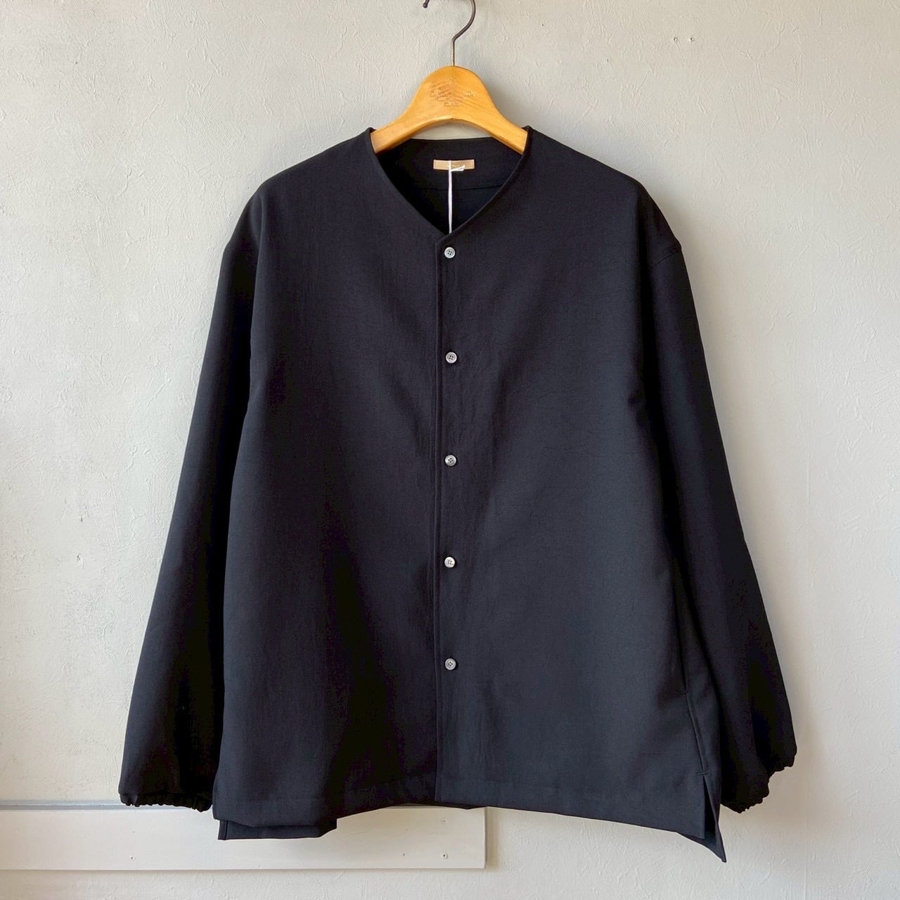 裏地を省いた一重の「軽量仕立て」のため、着心地はまるでシャツのように軽やかです。しかし、首元のスッキリしたノーカラーデザインが、カーディガンよりも端正で、ジャケットよりも気負わない絶妙な立ち姿を演出します。
