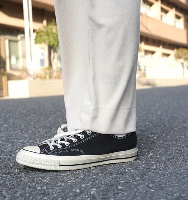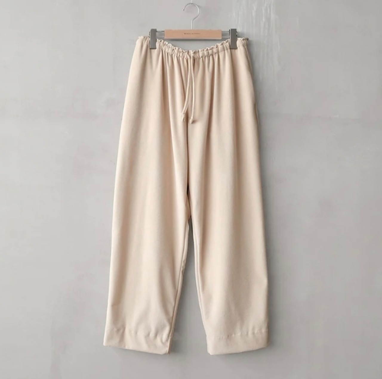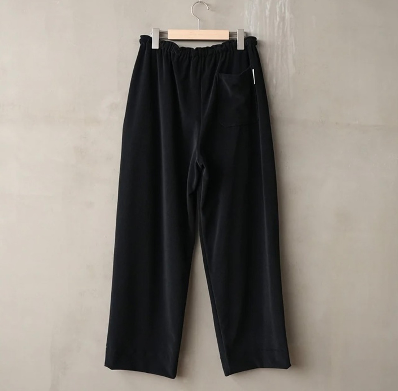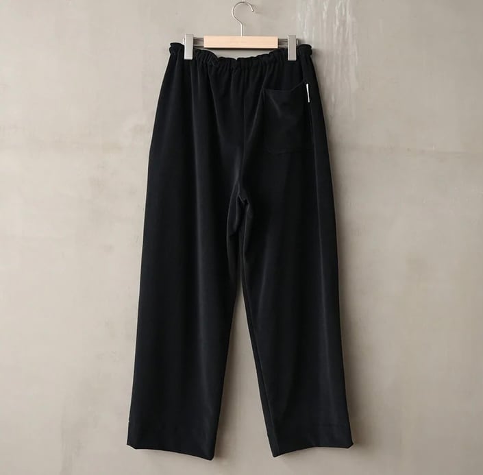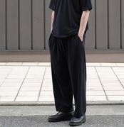 上品な生地の表面感を活かしたシンプルなディテールと裾をすっきりとさせ抜け感のあるワイドなシルエットによって高級かつリラックス感あふれるパンツです。