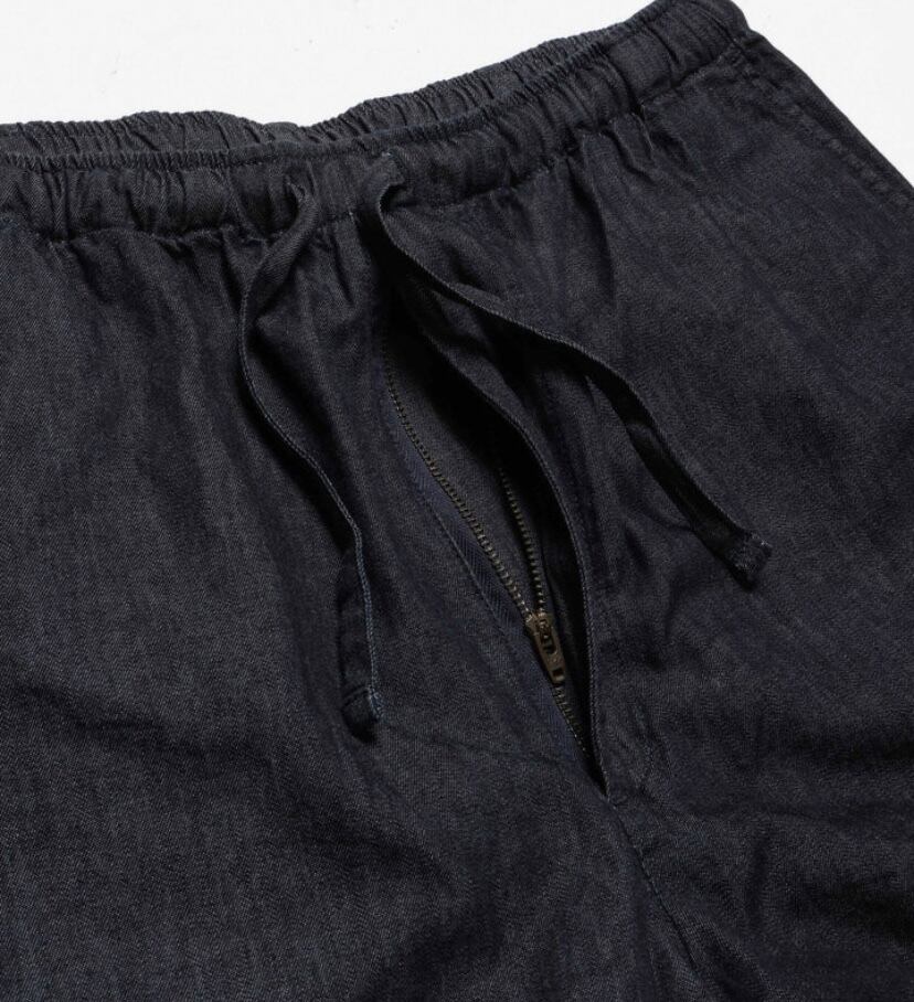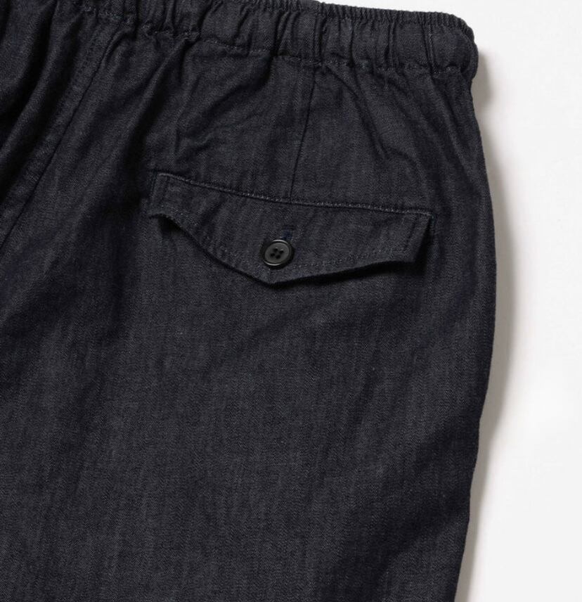 【ライトデニムの軽快さを活かした、リラックステーパードパンツ】6オンスのライトデニムを使用し、リンス加工で柔らかく仕上げた一本。薄手ならではの軽快さと、むら糸による豊かな表情が特徴です。ウエストはゴムシャーリングと同素材のコードを備えたイージー仕様で、リラックスした穿き心地を実現。両サイドにはシームポケットを、ヒップにはフラップポケットを配し、実用性を持たせています。シルエットは腰回りにゆとりを持たせつつ、裾にかけて自然に絞ったテーパードライン。カジュアルな中にクリーンな印象を宿し、シャツやベストとのレイヤードで春夏らしい軽やかなスタイリングを楽しめる一本です。