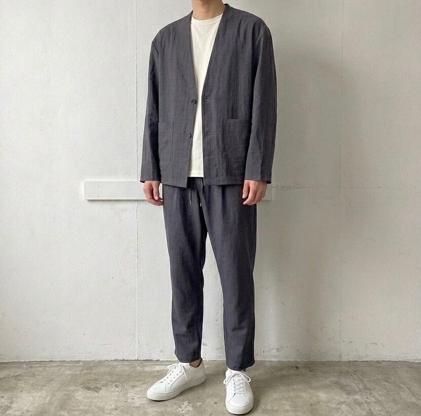 吸水速乾性と優れたストレッチ性を備えた強撚ポリエステル素材を使用し、ほのかに麻のような情緒を感じさせるドライな質感を実現しました。