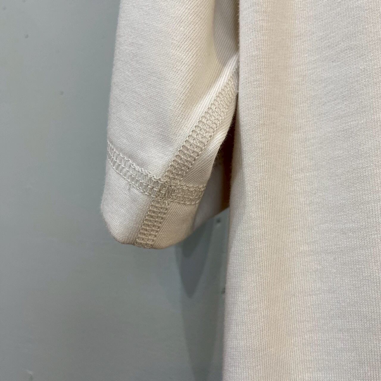 主な縫製は裏側の縫い代がごろつかないフラットシーマ。初夏から暑さの残る秋への着用を快適にする素材と縫製のTシャツです。